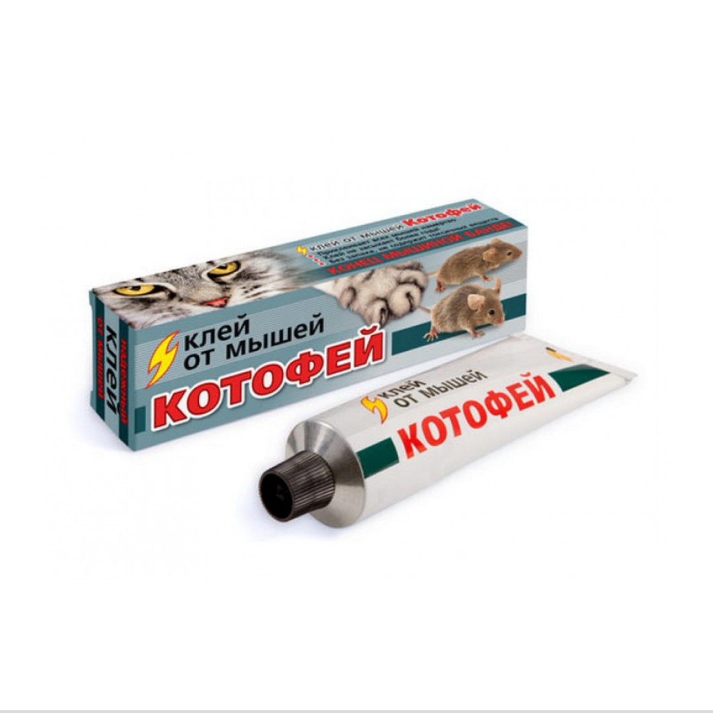 Клей «Котофей» предназначен для отлова мышей и мелких крыс, обладает замечательными клеящими свойствами, надежно фиксирует «влипших» грызунов. Не содержит токсичных веществ, не пахнет, не отпугивает грызунов запахом. Легко наносится на подложки, имеет оптимальную консистенцию, не растекается. В «намазанном» виде очень, очень долгое время не высыхает, не покрывается коркой и не теряет своих свойств. Прекрасно ловит мышей как в сухих, так и во влажных помещениях, а также вне помещений. (Клеящие свойства немного снижаются лишь на морозе).