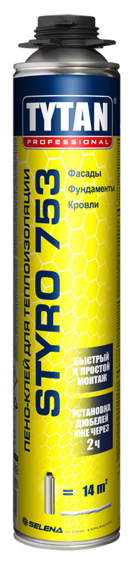 Профессиональный однокомпонентный полиуретановый клей, предназначенный для приклеивания плит из пенополистирола при утеплении наружных стен, как новых зданий, так и существующих, в системах теплоизоляции «мокрого типа». Благодаря применению клея, работа становится в 7 раз легче и в 5 раз быстрее, а сила приклеивания в 3 раза выше. Одним баллоном можно приклеить пенополистирол на площади около 8 м2, при температуре +20ºC. При этом зазор между стеной и пенополистиролом должен быть не менее 5 мм. Клей очень удобно наносится, а благодаря его применению монтаж плит из пенополистирола существенно упрощается. Применение клея позволяет уже через 2 часа шлифовать и дюбелировать плиты из пенополистирола. Клей обладает высокой адгезией к бетону, минеральным основаниям, к пенополистиролу, а также к металлу и дереву.