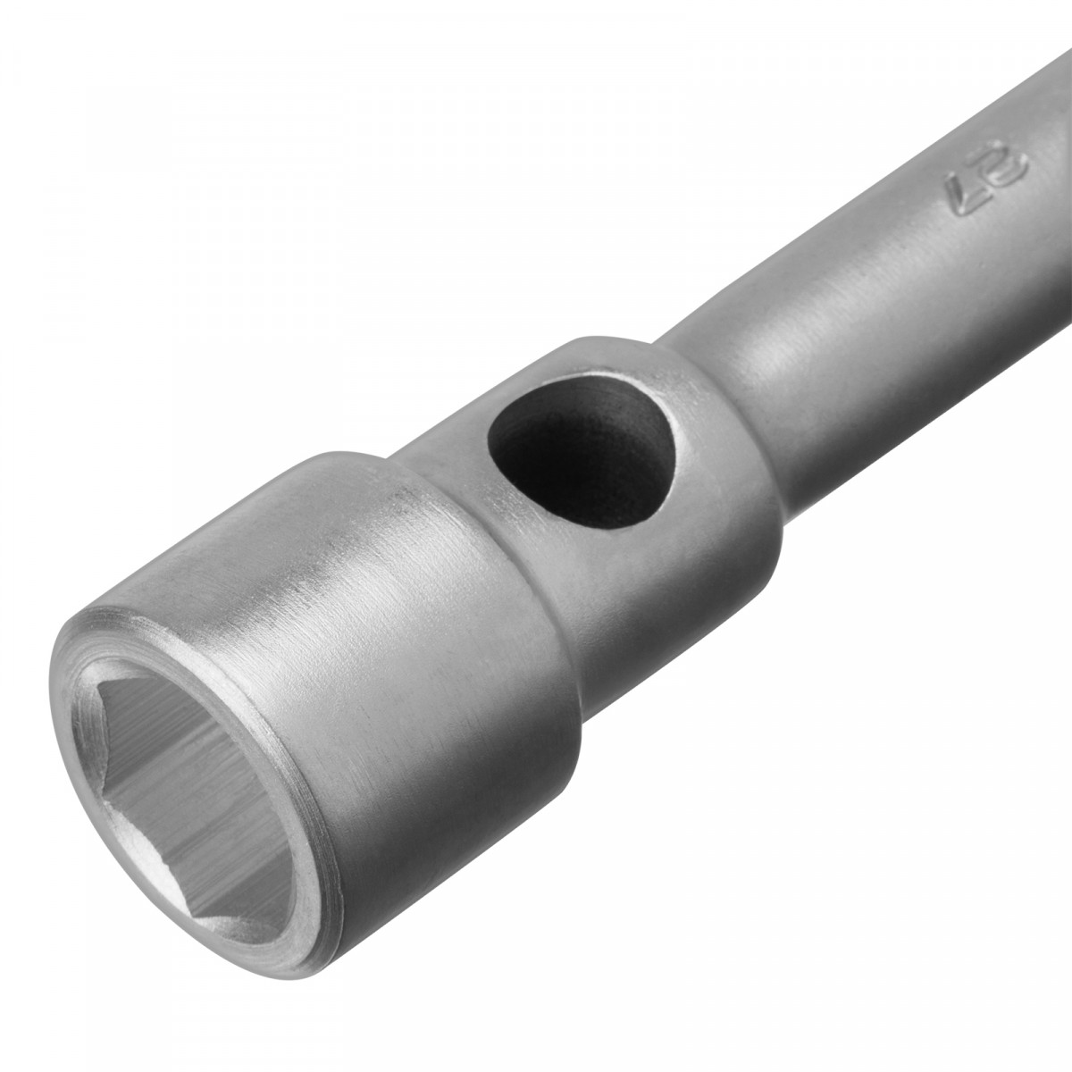Двухсторонний баллонный ключ Matrix 14295, 24 х 27 мм, толщиной 26 мм и длиной 350 мм, используется для шиномонтажных работ на грузовом транспорте и автобусах. Две несъемные торцевые шестигранные головки подходят под крепеж 24 и 27 мм. Инструмент применяется на станциях техобслуживания.