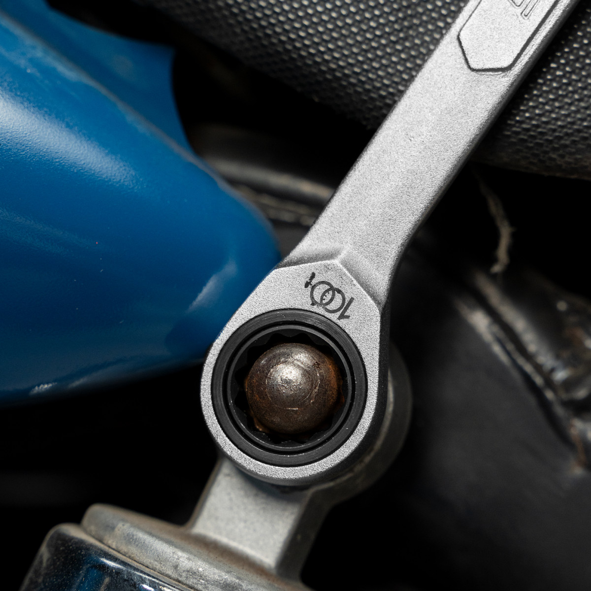 - Храповый механизм оснащен 100 зубцами, что обеспечивает плавность хода инструмента (шаг трещотки всего 3,6 градусов) и делает его удобным для работы в ограниченном пространстве.