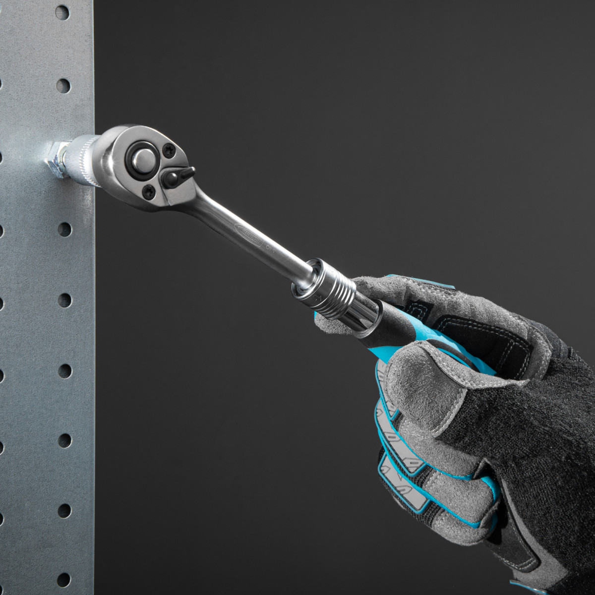 - Высокая износостойкость — ключ-трещотка изготовлен из прочной стали хромованадиевой группы.