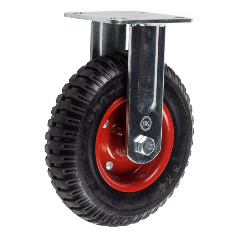 Колесные опоры неповоротные платформенного крепления. Литая протекторная резина, цвет - черный. Обод - стальной прессованный.