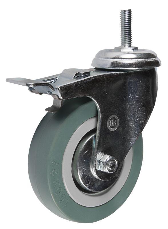 Колесо аппаратное SCtgb25 со штырем и тормозом относится к легкой серии колес. Ободная часть аппаратной колесной опоры со штырем и тормозом SCtgb25 изготовляется из серого полипропилена с двумя боковыми пыльниками, защищающими осевой механизм от повреждения посторонними веществами и пылью.Главной особенностью аппаратных колесных опор со штырем и тормозом SCtgb25 является термоэластичный контактный слой, не наделяющий следами любые поверхности пола. Благодаря отмеченным особенностям шинки, аппаратные колесные опоры со штырем и тормозом SCtgb25 используются для медицинских кроватей и других транспортных конструкций в помещениях с маркими полами, для аппаратуры, бытовой и офисной мебели, для медицинской техники и оборудования, металлической мебели, стеллажей, на тележки-"шпильки"для пищевых производств, для гостиничного оборудования и химчисток.В основе поворотного механизма аппаратной колесной опоры SCtgb25 находится двухрядный шариковый подшипник. В оси колесной опоры аппаратного типа с креплением со штырем применена втулка скольжения. Аппаратные колесные опоры со штырем и тормозом SCtgb25 обладают типовым креплением: отвести предназначенной для вхождения крепежного болта.Термические условия эксплуатации аппаратных колесных опор находятся в рамках от - 20°С до +50°С. Максимальная грузоподъемность колеса SCtgb25 – 27 кг.