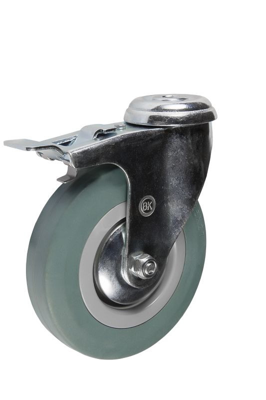 Колесная опора с серой резиной поворотная с тормозом адаптирована для работы в помещениях. Серая резина обладает очень мягким ходом и является достаточно маневренной.Данная опора оснащается двухрядным шарикоподшипником и имеет втулку скольжения оси. Шинка колесной опоры серая резина изготавливается из полипропилена серого цвета, чьей особенностью является шумопоглощение, малая вибрация и отсутствие следов на поверхности.Эта серия колес часто применяется при изготовлении медицинского передвижного оборудования, различных деталей мебели, складских тележек, для аппаратуры, бытовой и офисной мебели, для медицинской техники и оборудования, стеллажей, на тележки-"шпильки"для пищевых производств, для гостиничного оборудования и химчисток.Заводской температурный режим для данной серии варьируется между -20С° и +50С°. В качестве крепления использовано отверстие, которое предусматривает вкручивание болта. Тормоз, предусмотренный конструкцией, в случае необходимости обеспечивает неподвижность конструкции.