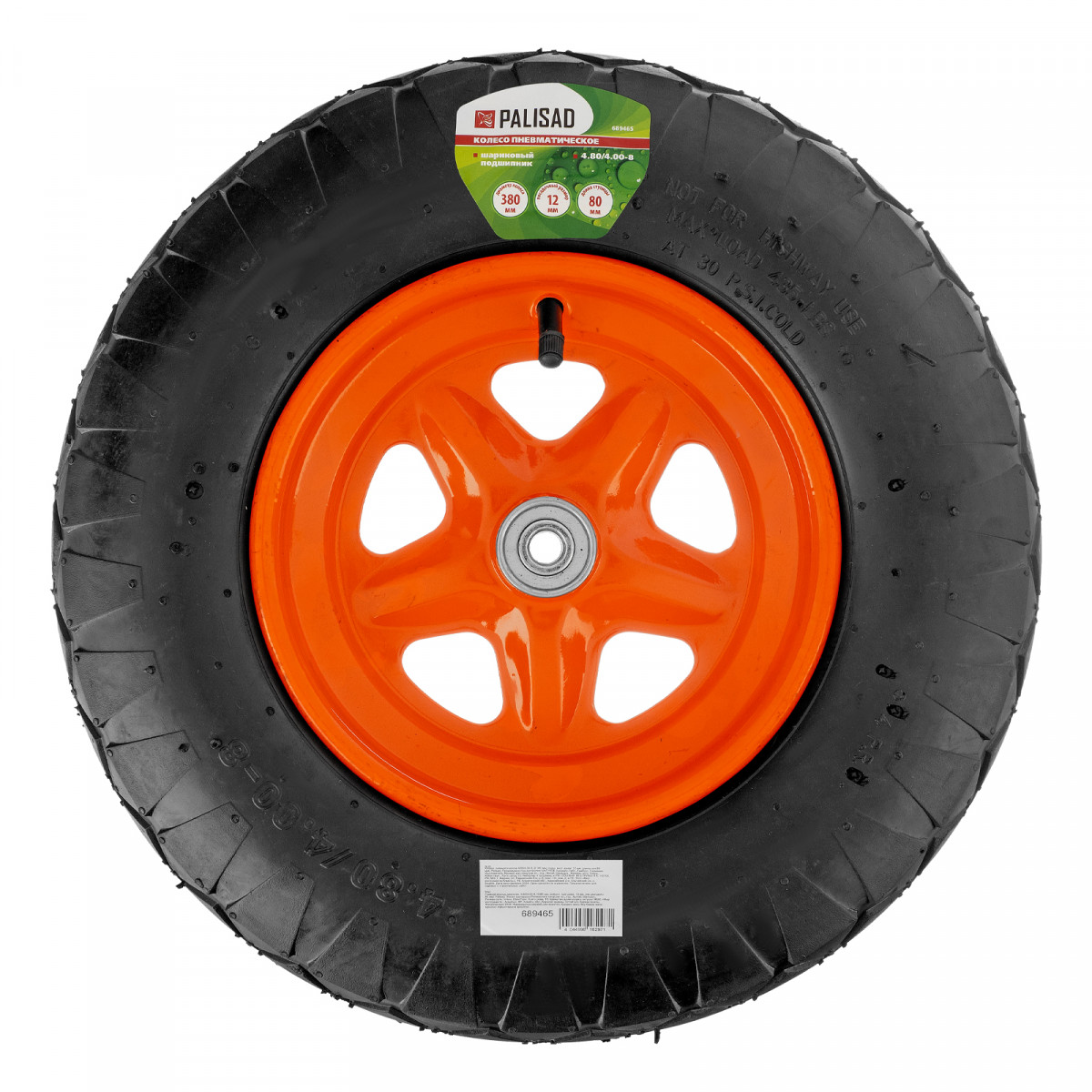 Пневматическое колесо 4,80/4,00-8 Palisad «Звезда» 689465 диаметром 380 мм имеет длину оси 80 мм и внутренний диаметр подшипника 12 мм, устанавливается на тачку Palisad 68912 для транспортировки грузов. Обладает хорошей проходимостью, а благодаря стальным подшипникам выдерживает нагрузки до 100 кг.