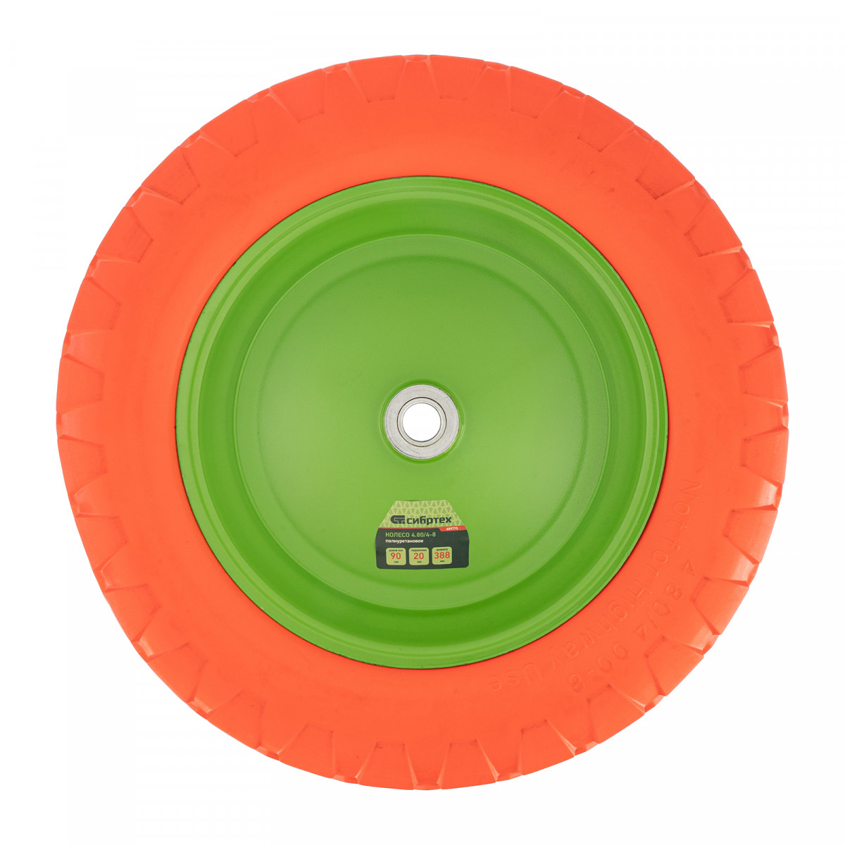 Полиуретановое колесо 4.80/4-8 Сибртех 689775 с длиной оси 90 мм и диаметром подшипника 20 мм — движущий элемент тачек Palisad 68923, 689233, 68937, Сибртех 689643 и др. Непрокалываемое колесо подходит для использования в самых жестких условиях. В отличие от пневматических колес не требует подкачки, обслуживания и легко отмывается от грязи.
