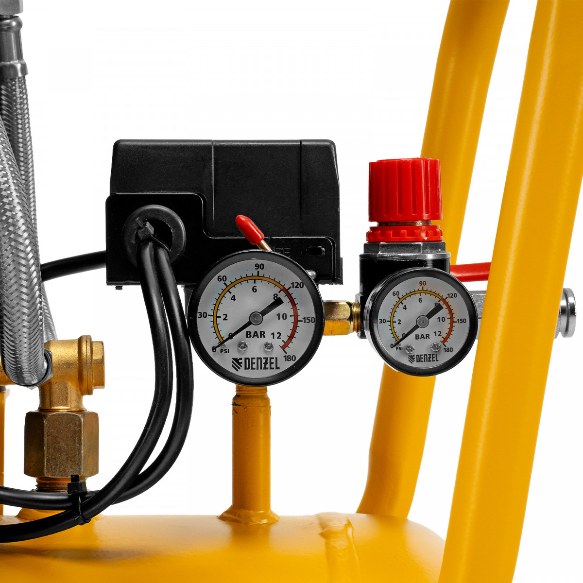 • Удобный контроль работы — компрессор оснащен 2 манометрами для отслеживания давления в ресивере и пневмолинии