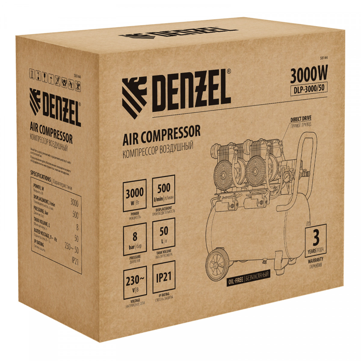 Компрессор безмасл. малошумный DLP -3000/50, 3 кВт, 2х1,5 кВт,50 л, 2850 об/мин,500 л/мин Denzel
