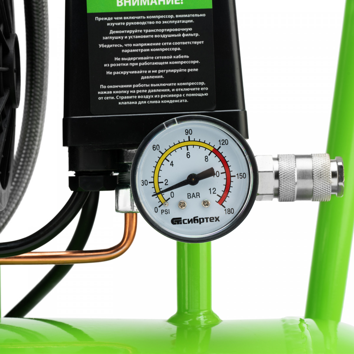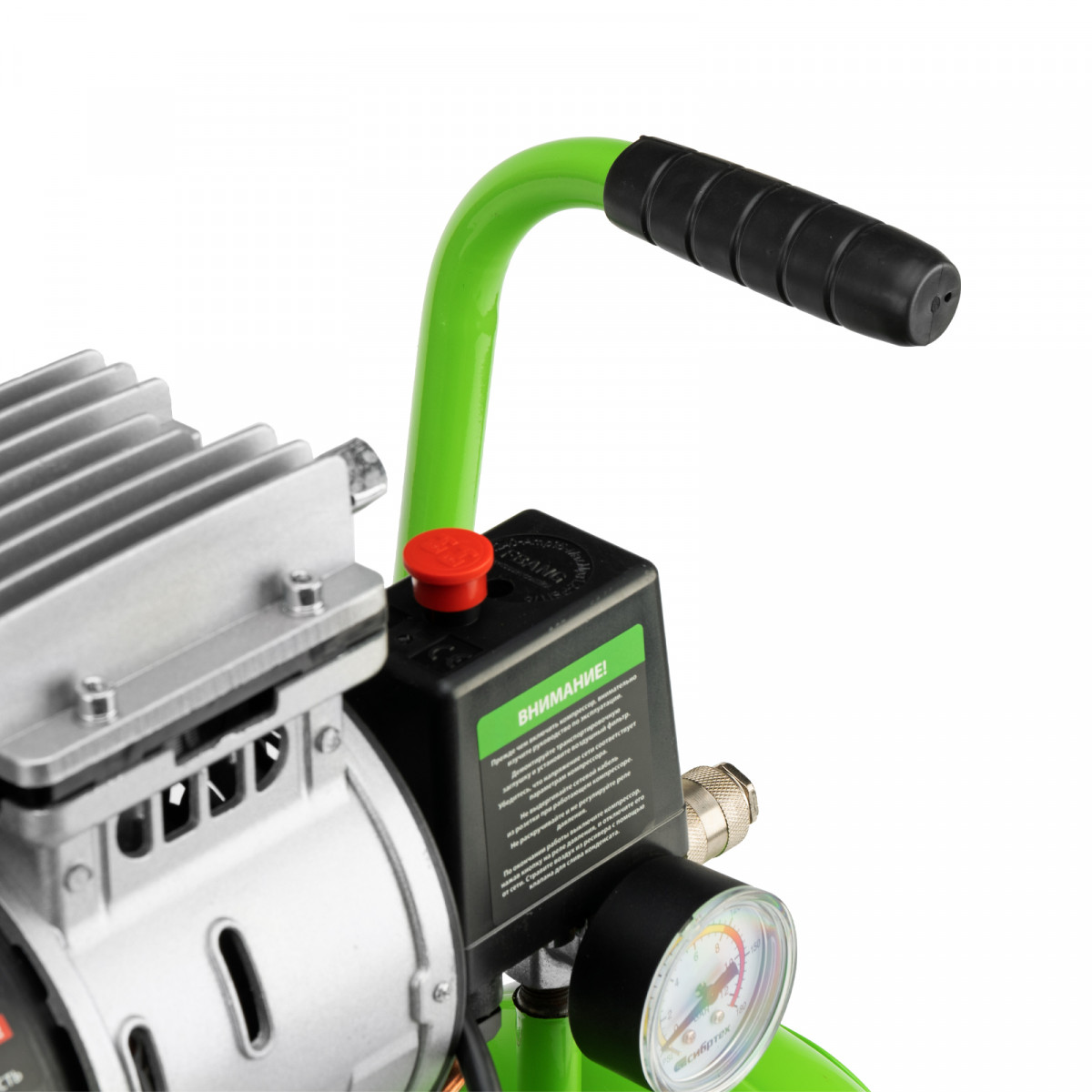 - Контроль рабочих параметров — компрессор оборудован механическим манометром для отслеживания давления.