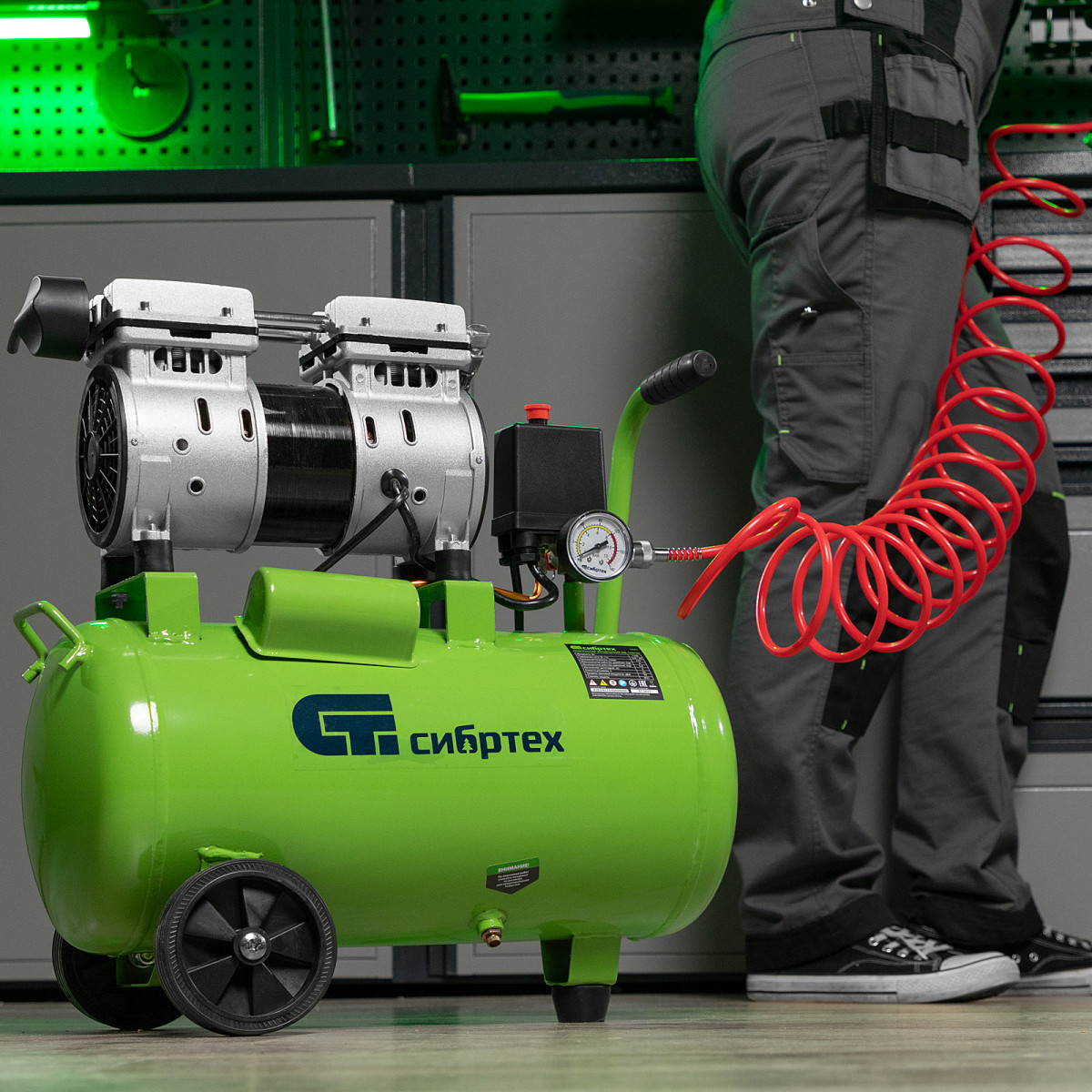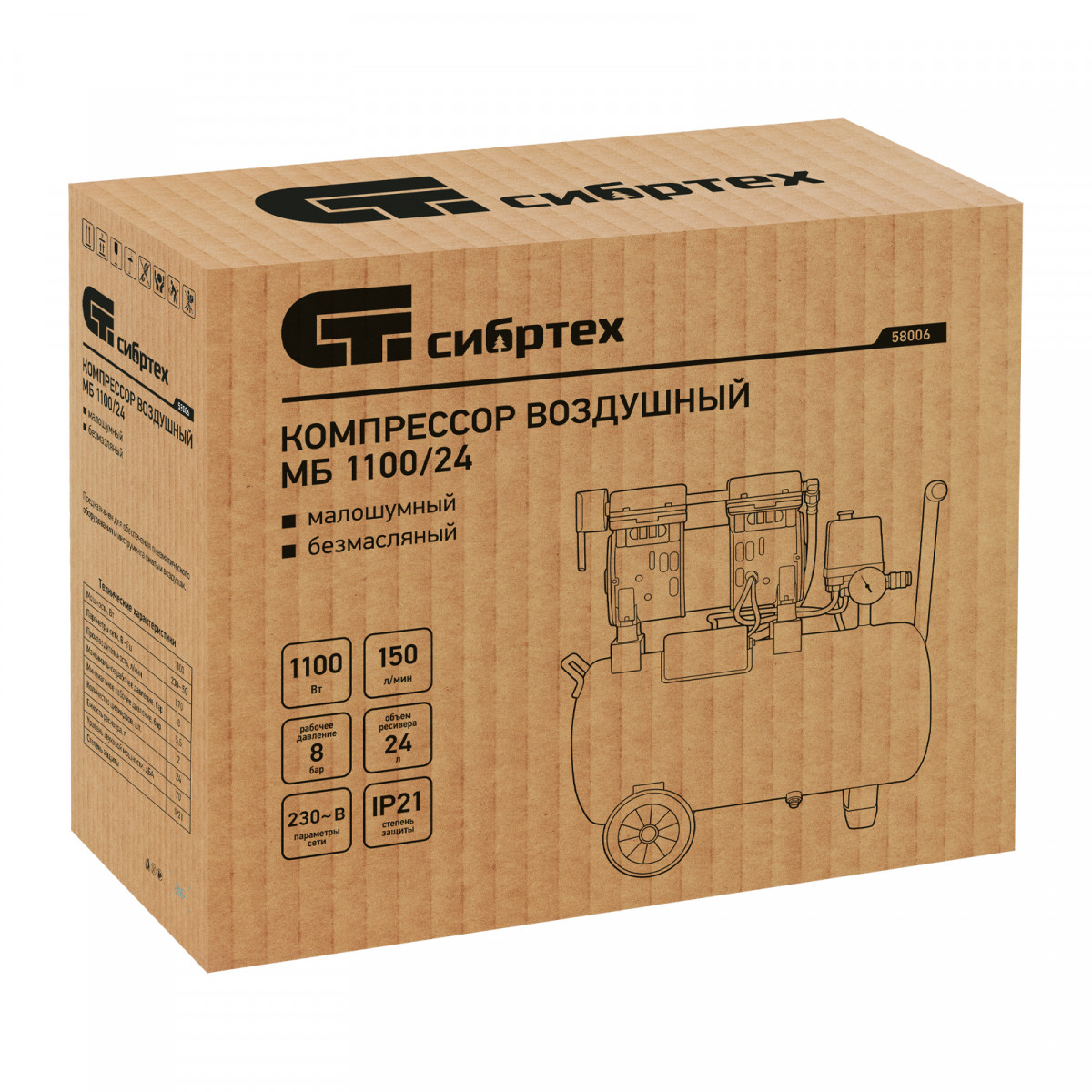 Безмасляный малошумный компрессор Сибртех МБ 1100/24 58006 мощностью 1100 Вт и объемом ресивера 24 л имеет производительность на входе 170 л/мин и сжимает воздух под давлением до 8 бар. Используется для обеспечения функционирования пневмоинструмента, например, краскораспылителя или пневматического шуруповерта. Для работы устройства не требуется масло, поэтому воздух на выходе не содержит его частиц. Компрессор оптимален для проведения покрасочных работ и продувки электронных компонентов.,Одна из ключевых особенностей компрессора — низкий уровень шума (не превышает 70 дБ), позволяющий использовать устройство в жилом помещении без дискомфорта для людей.