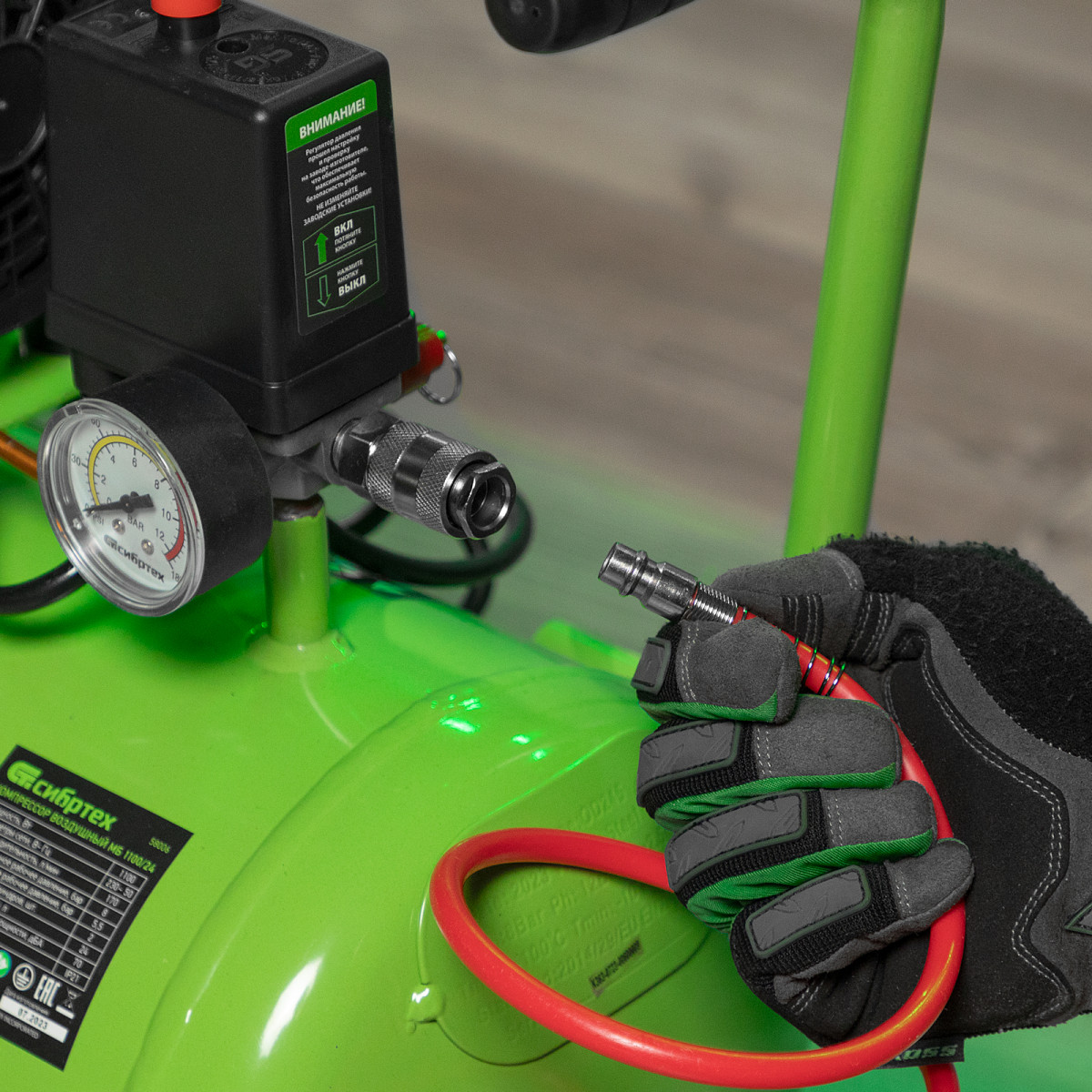 - Простое подключение — выходной быстросъемный коннектор позволяет подсоединить пневмоинструмент одним движением.