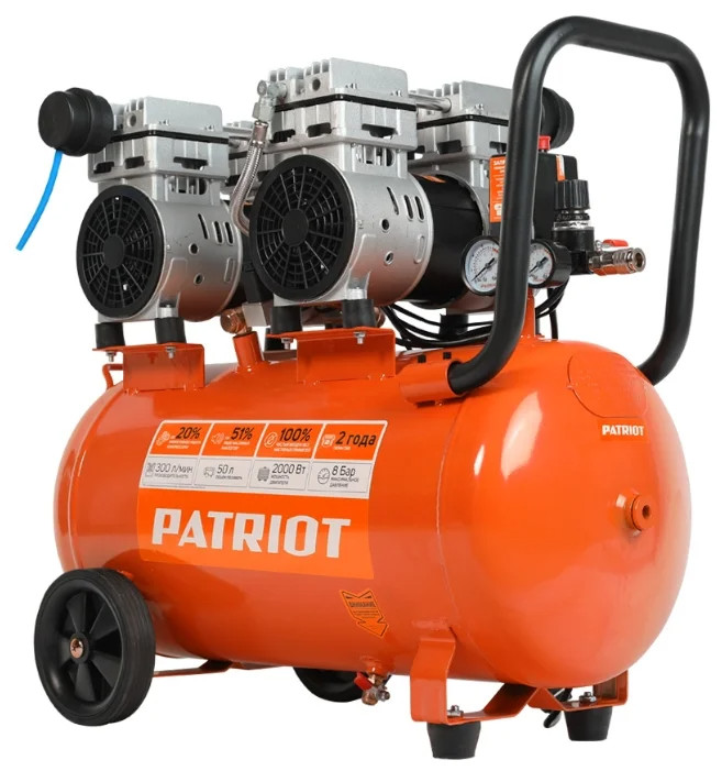 • Поршневой безмасляный компрессор PATRIOT WO 50-300 525301925 готов к работе сразу после покупки, не требует заправки маслом, а так же контроля за наличием масла и его замены