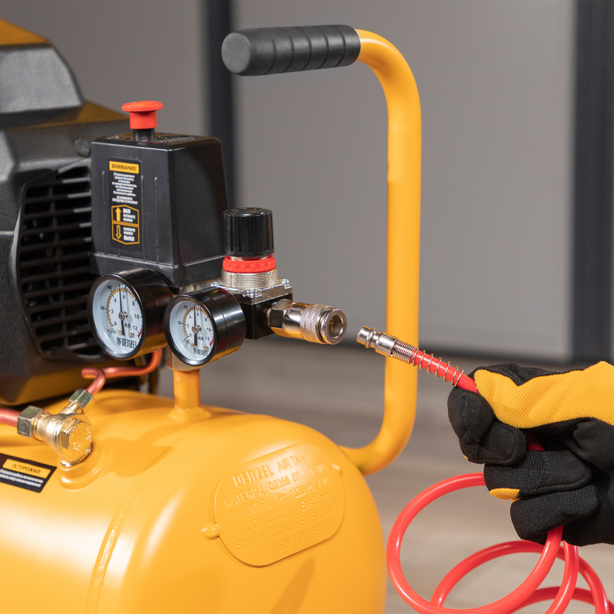 • Удобный контроль рабочих параметров — 2 манометра отображают давление в ресивере и выходной магистрали.