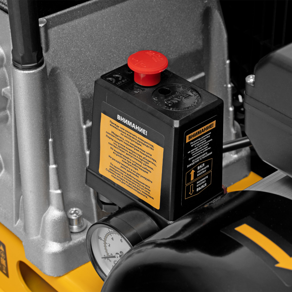 - Безопасность — в случае превышения максимально допустимого давления в ресивере срабатывает предохранительный клапан.