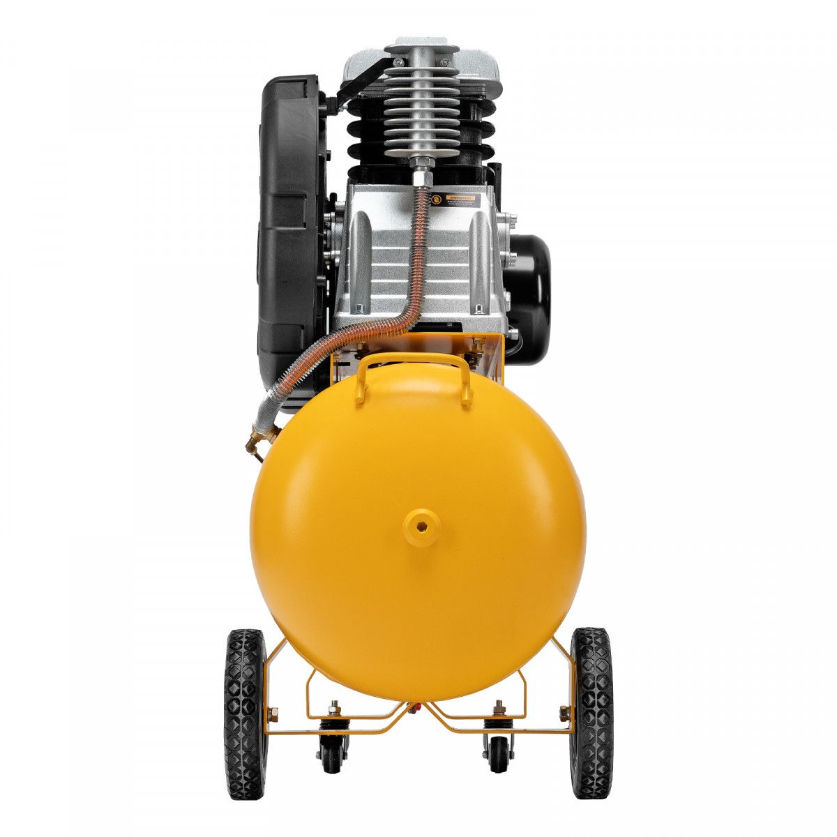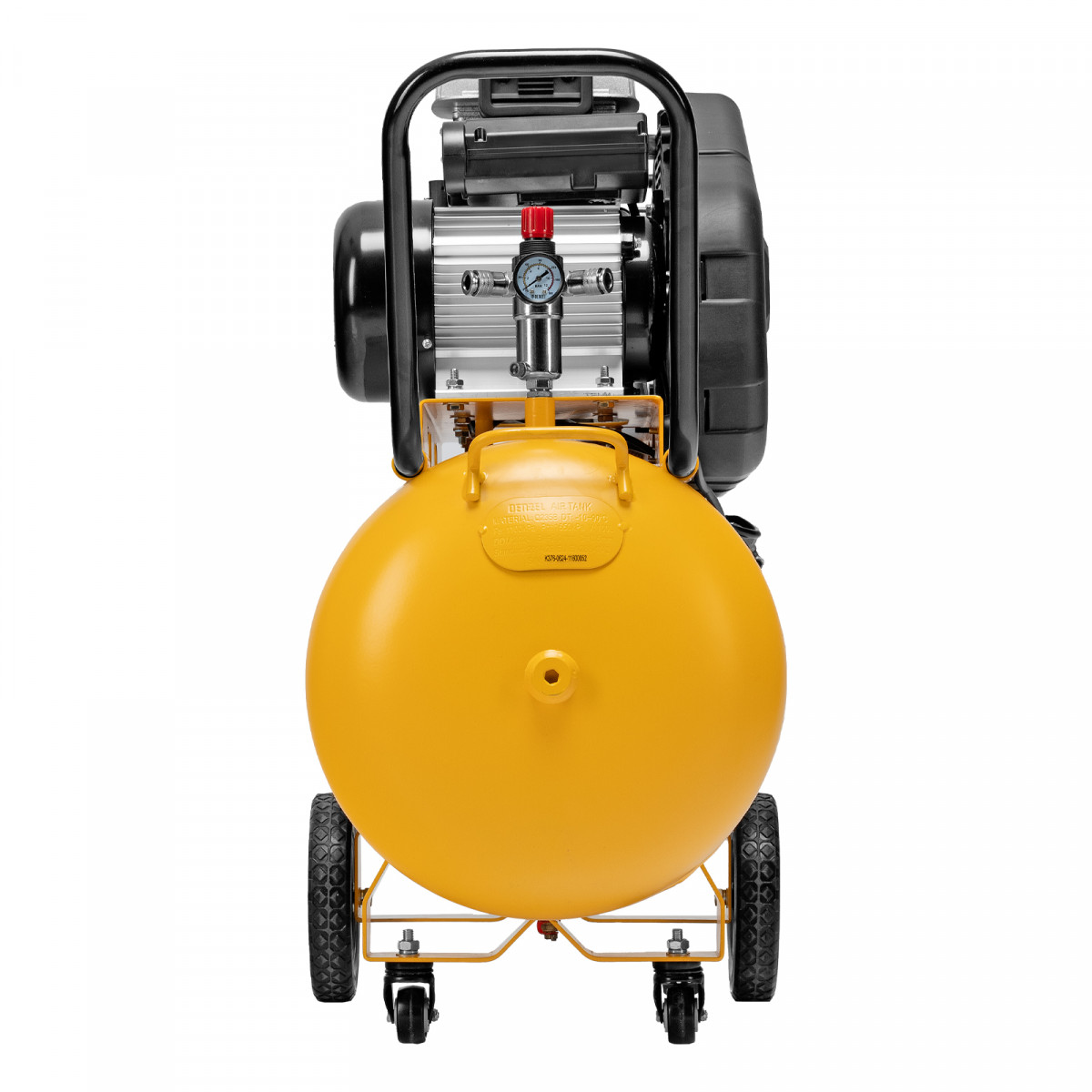 - Удобная транспортировка — на компрессоре установлены колеса, в т. ч. поворотные, и П-образная рукоятка.