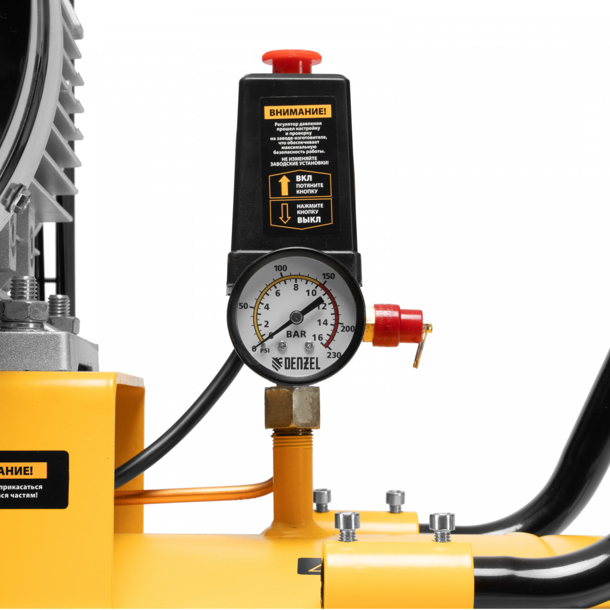 - Удобный контроль давления в ресивере и пневмомагистрали — компрессор оснащен двумя механическими манометрами.