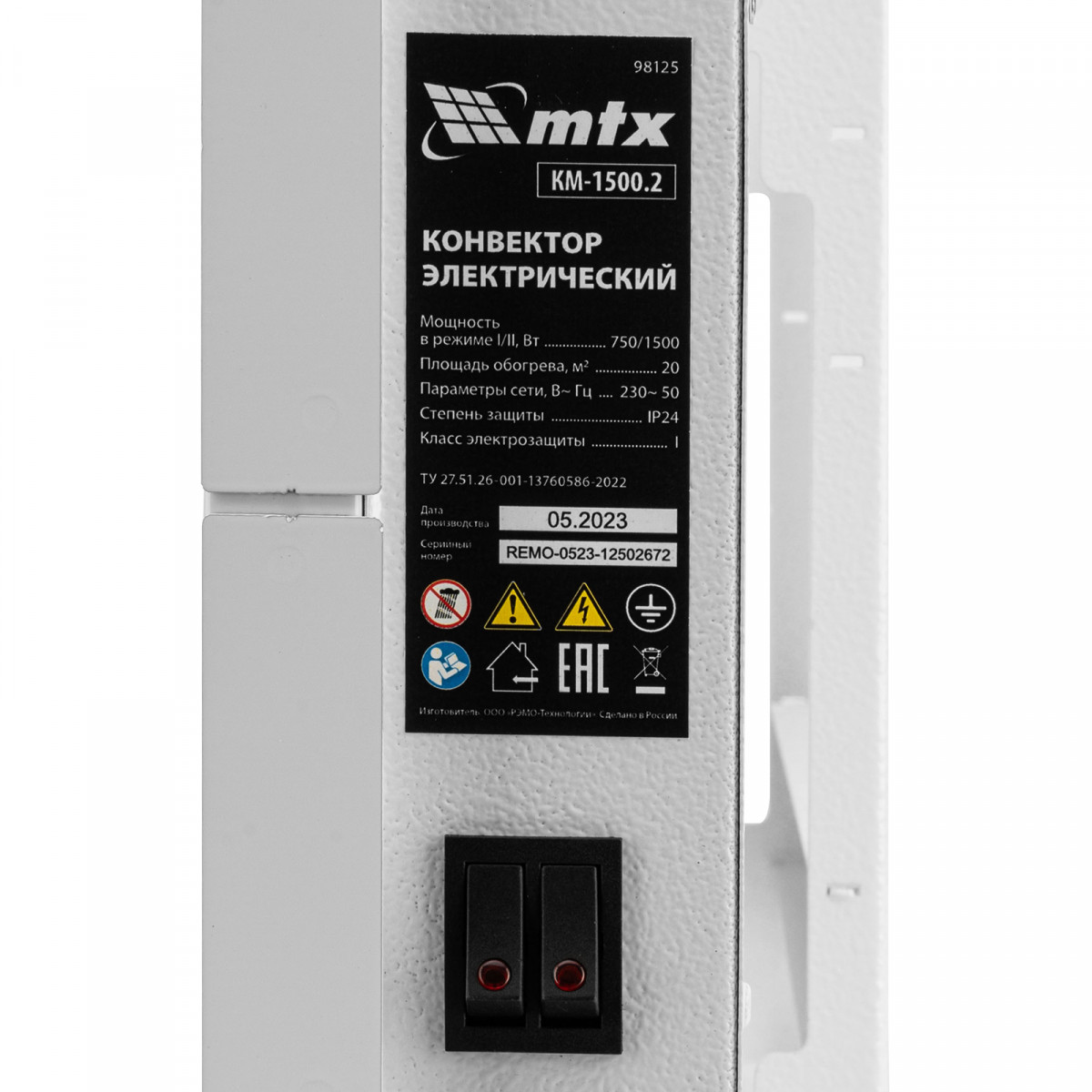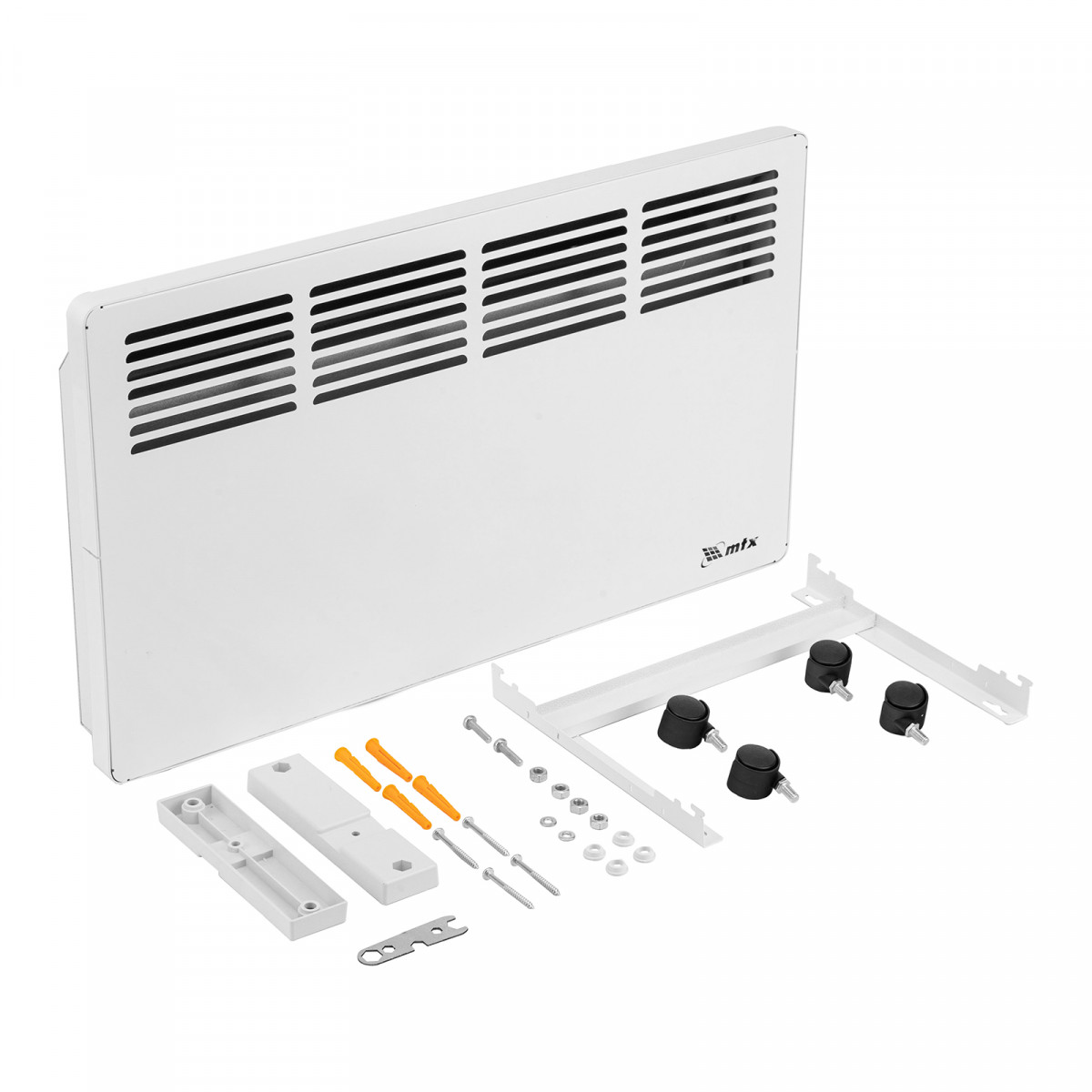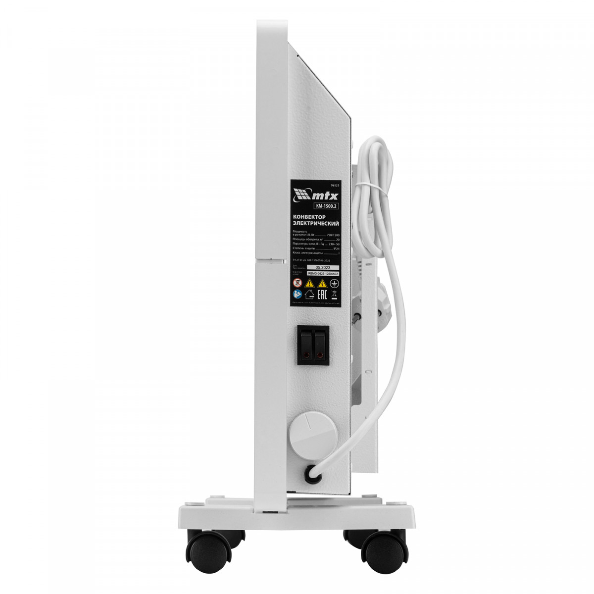Конвектор электрический MTX KM-1500.2 98125 с X-образным нагревателем, колесами и термостатом, мощностью 1500 Вт, предназначен для использования в закрытых помещениях: квартирах, офисах, на производствах, в общественных местах и т.д. Рекомендуемая площадь обогрева составляет 20 кв.м. Х-образный нагревательный элемент обеспечивает быстрый и равномерный прогрев помещения до необходимой температуры, при этом не сушит воздух.