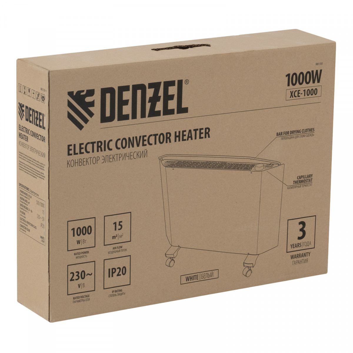 Электрический конвектор Denzel XCE-1000 98130 белого цвета, максимальной мощностью 1000 Вт, с сушилкой для одежды, колесами и X-образным нагревательным элементом, работает от сети 230 В и предназначен для обогрева закрытых помещений площадью до 15 м2. Надежный и долговечный X-образный нагревательный элемент обеспечивает быстрый нагрев до необходимой температуры.
