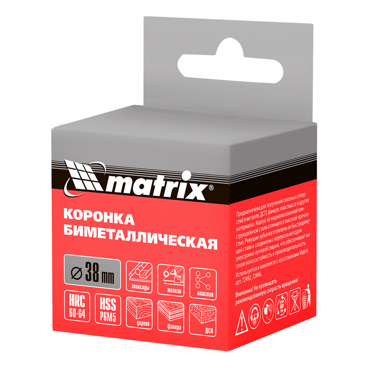 Коронка Matrix BIMETAL 72438 диаметром 38 мм — режущий инструмент, который устанавливается на дрель, перфоратор или стационарный станок. Используется для быстрого сверления черных и цветных металлов, пластика и других материалов. Позволяет получить отверстия большого диаметра при проведении электромонтажных работ и прокладке коммуникаций.