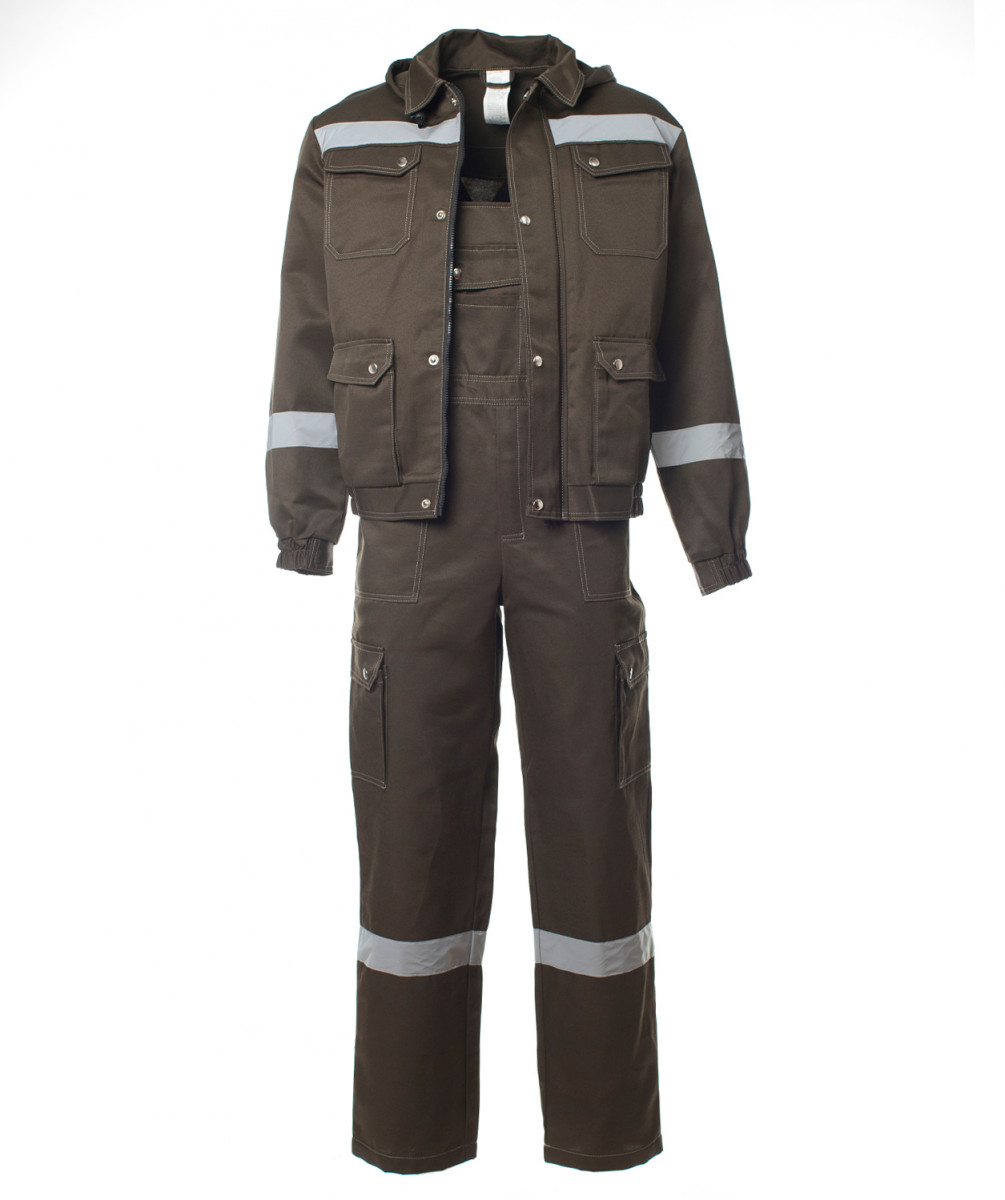 Костюм с контрастной отстрочкой.Верхние накладные карманы с фигурными клапанами и перекантом на кнопках.Нижние карманы с полуобъемом, с фигурными клапанами и перекантом на кнопках.Укороченная куртка на поясе с частичной стяжкой на эластичной резинке.Съемный капюшон на пуговицах с регулировкой объема по лицевой части.Полукомбинезон с многофункциональными карманами.Эластичная резинка по талии спинки.Гульфик на молнии и застежкой в правом боковом шве.В костюме используется светоотражающая полоса 50 мм.