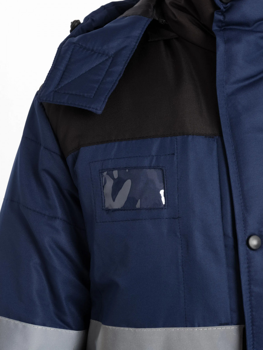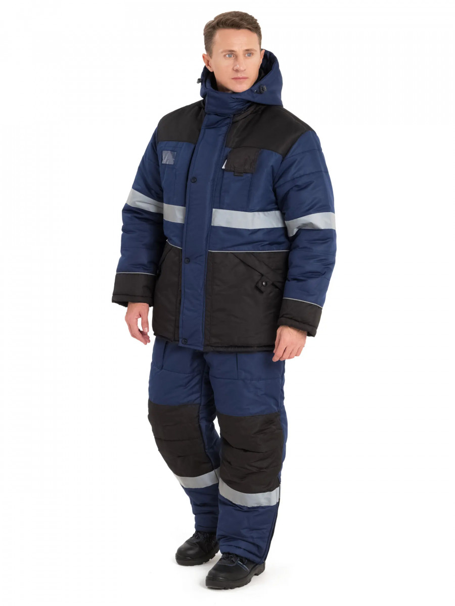 Костюм состоит из куртки и полукомбинезона. Куртка со светоотражающими полосами и кантом, с центральной застежкой на молнию, ветрозащитным клапаном на текстильную застежку с чередованием кнопок и внутреннюю планку с уголком для защиты подбородочной части от молнии. Воротник стойка, с внутренней стороны флис, съемный утепленный капюшон. На правой полочке нагрудный карман для бейджа. Рукава с внутренними трикотажными манжетами. Полукомбинезон со светоотражающими полосами , с центральной застежкой на молнию и планку на текстильную застежку, на регулируемых по длине бретелях. На правой передней половинке нагрудный карман для сотового телефона. Состав: 100% полиэстер Ткань: Taslan 228 Milky PU, пл.135 г. Ткань из 100% нейлона с нанесением полиуретанового покрытия Подкладка: Таффета 190Т Утеплитель куртка - синтепон 2 слоя по 150 г., Termofinn 150г.; полукомбез - синтепон 150 г., Termofinn 150г. Защита 3 класс защиты, lV и особый климатический пояс ГОСТ Р 12.4.236-2011