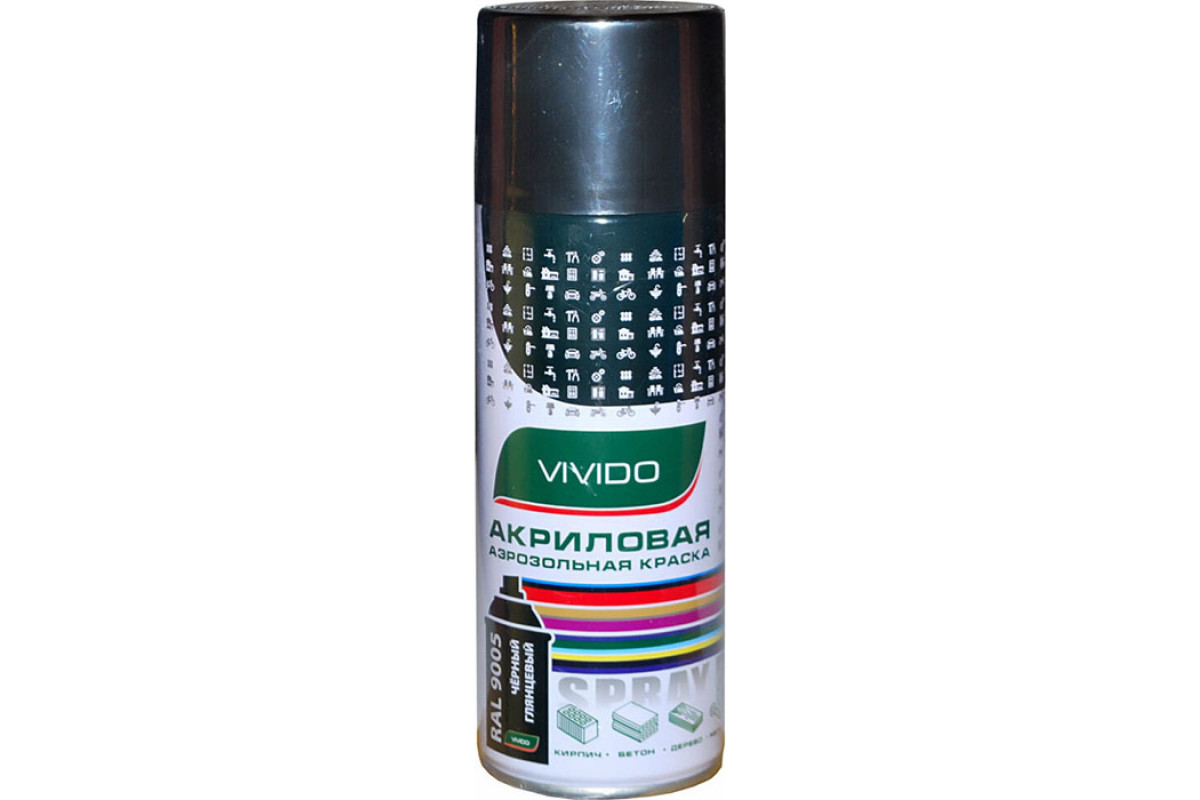 Акриловая аэрозольная краска Vivido черный глянцевый RAL 9005 VI9005 предназначена для высококачественного окрашивания деревянных, металлических, пластиковых, каменных, бетонных, керамических и др. поверхностей. Служит для обработки различного оборудования, приборов, мебели, оконных рам, дверей, дверных ручек, элементов сантехники, инструментов, предметов декора, изделий ручной работы, автомобилей, мотоциклов и прочего.