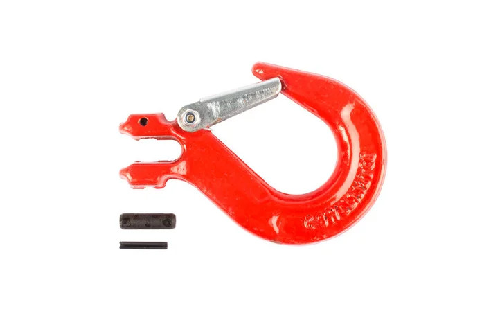 Крюк стальной с вилочным креплением применяется при изготовлении  цепных стропов (чалок) и грузозахватных приспособлений, а также при проведении буксирных и такелажных работ в качестве концевого элемента. Характеристики: 4-х кратный запас прочности на разрыв (8 класс прочности), имеет вилочную систему крепления, оснащен пластинчатым замком. Благодаря вилочной системе крепления (сопряжения) может крепиться к стропу без использования  соединительных звеньев (при помощи стального запорного пальца, фиксируемого шплинтом).  Использование комплектующих 8-го класса прочности производства TOR industries позволяет снизить вес стропа при сохранении нормативных параметров надежности.
