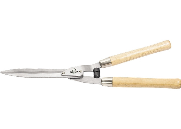 Кусторез с деревянными рукоятками и волнистыми ножницеобразными лезвиями. Предназначен для формирования кроны деревьев и кустарников и рассчитан на работу с ветвями диаметром до 10 мм. Волнистые лезвия дополнительно удерживают ветку во время работы. Упорный амортизатор служит ограничителем хода сжатия, одновременно смягчая остановку инструмента и предохраняя его от излома. Лезвия изготовлены из инструментальной стали У8 и остро заточены. Деревянные рукоятки защищены от рассыхания бесцветным лаком.