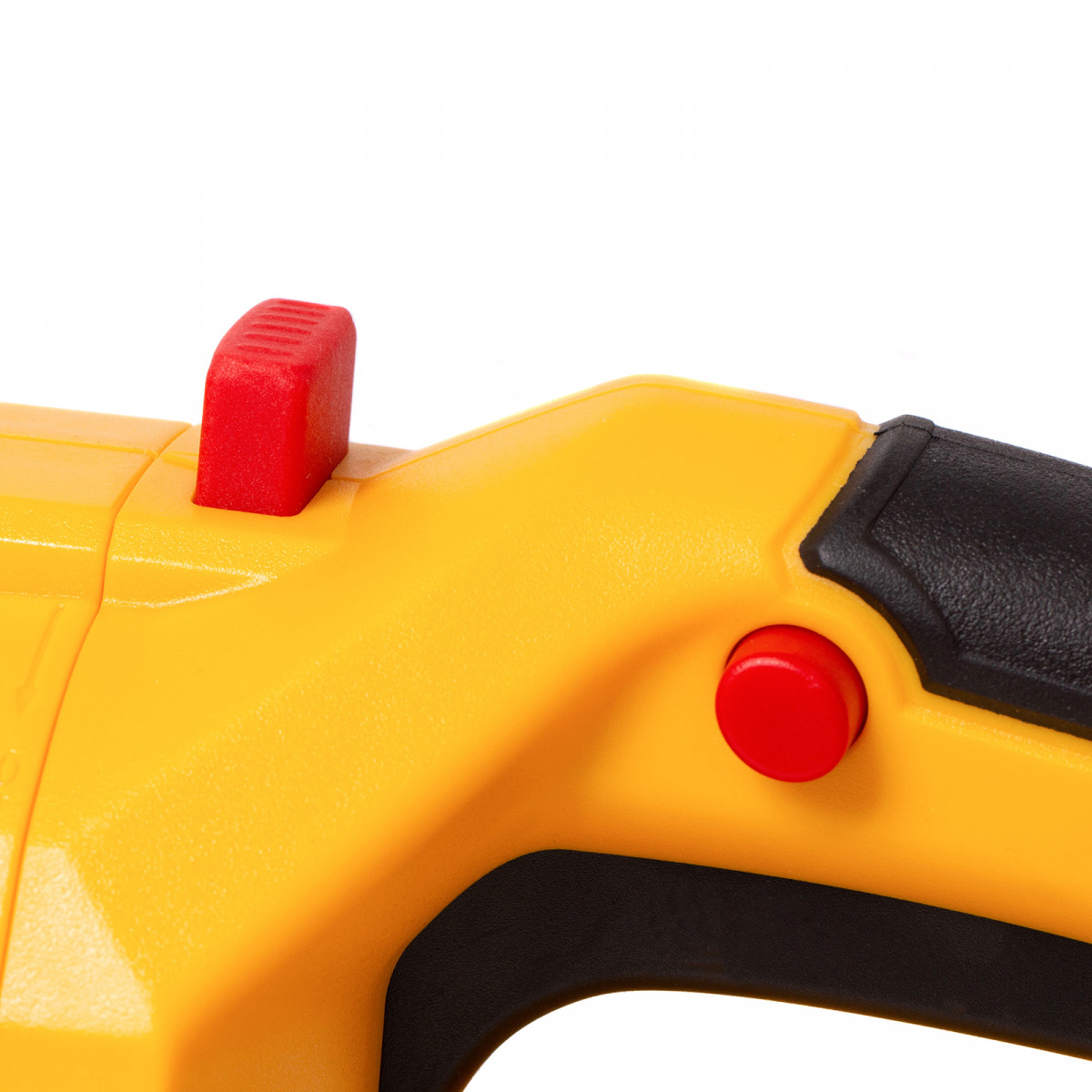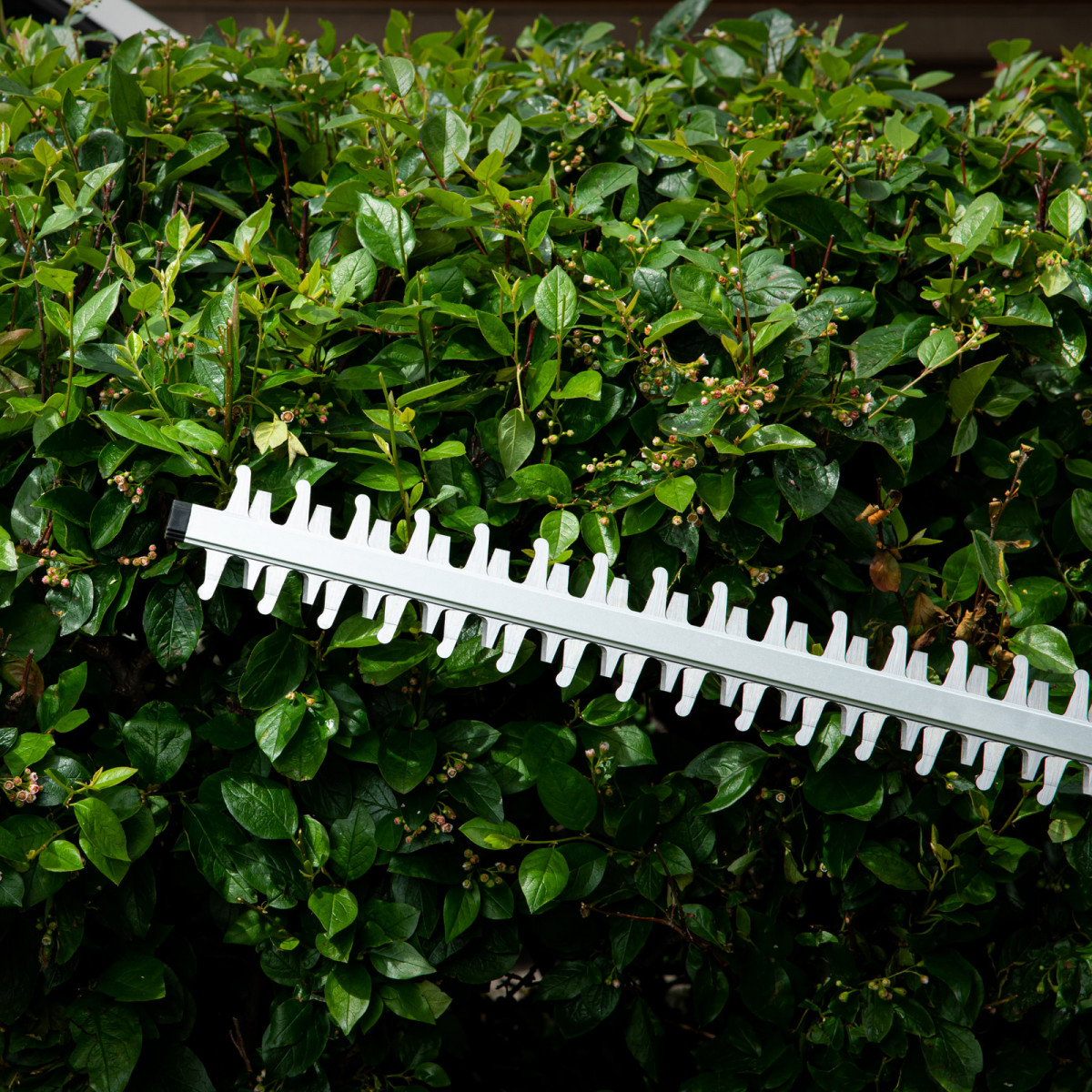 - Удобная работа под разным углом — рукоятку можно развернуть на 90 градусов влево и вправо для боковой подрезки кустарников, а для надежной фиксации предусмотрена кнопка блокировки поворота.
