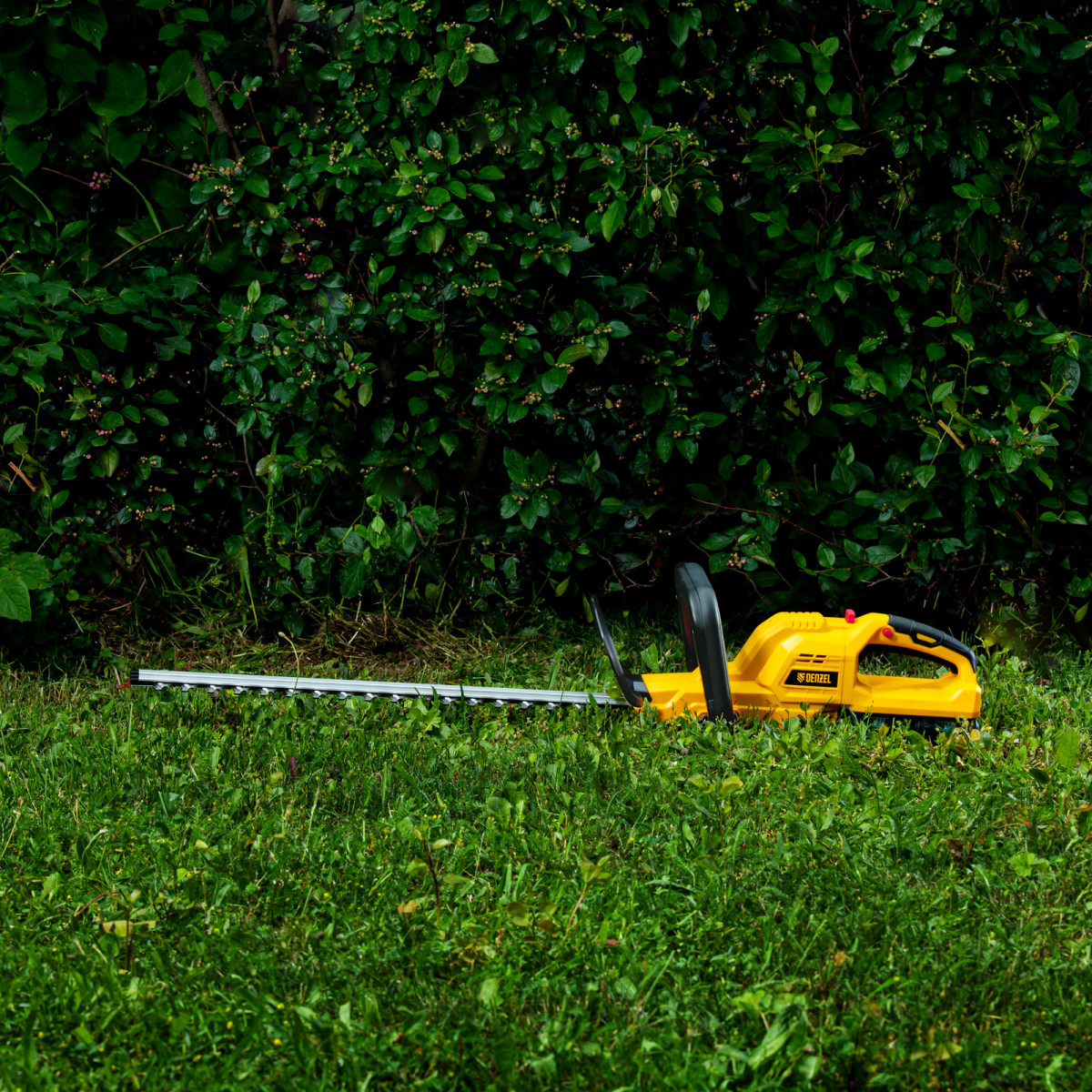Аккумуляторный кусторез Denzel RBC510-36 59410 с двумя Li-Ion батареями емкостью 4 Ач и суммарным напряжением 36 В, с поворотной ручкой, используется для стрижки кустарников и тонких веток деревьев, подрезания дикой поросли травы. С его помощью можно создать живую изгородь или ландшафтные скульптуры из декоративных растений. Нож длиной 510 мм обеспечивает толщину реза 24 мм.,Кусторез не зависит от сети электропитания, поэтому работать с ним можно в самых отдаленных участках сада. Устройство не выделяет вредных выхлопов и работает намного тише в сравнении с бензиновыми аналогами.