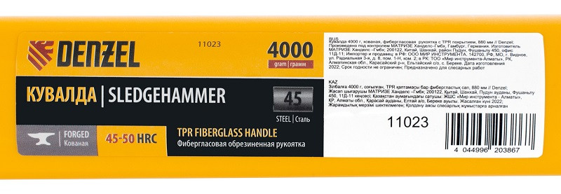 • Кованая кувалда Denzel 11023 с бойком весом 4000 г и фибергласовой обрезиненной рукояткой длиной 880 мм, с TPR покрытием, предназначена для проведения демонтажных работ: разрушения кирпичной кладки, камня и бетона, забивания клиньев, кольев, скоб и других тяжелых ударных работ