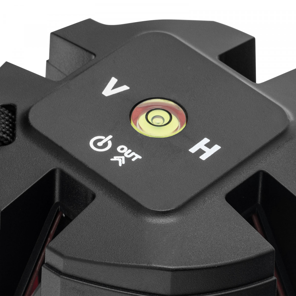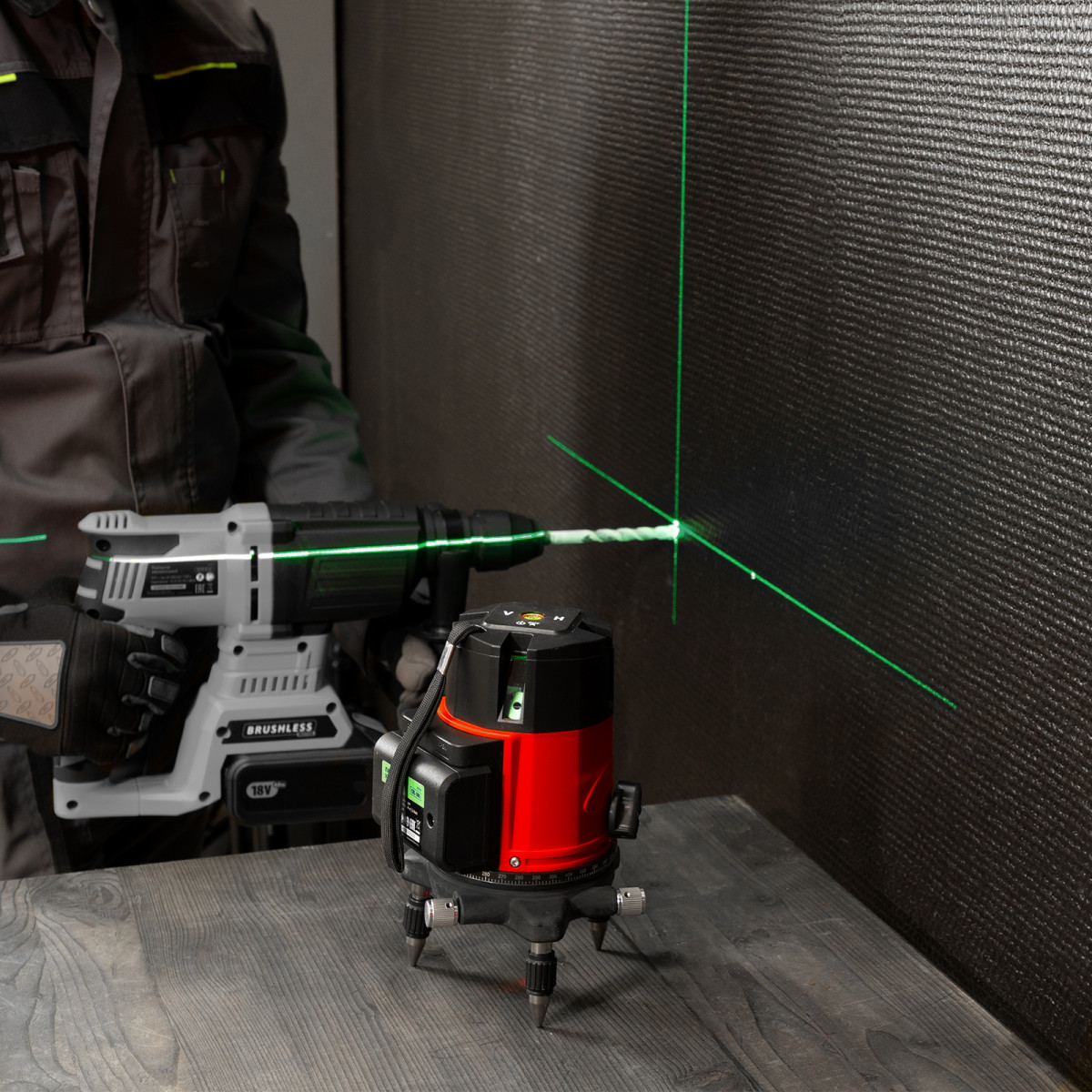 Лазерный уровень MTX CRL-30G 35036 с резьбой 5/8″ под штатив, в комплекте с батарейками, проецирует на поверхность 1 горизонтальный, 4 вертикальных луча зеленого цвета и точку отвеса дальностью до 30 м. Подходит для бытового применения в помещениях. Погрешность измерений составляет всего ±1,5 мм 5 м.