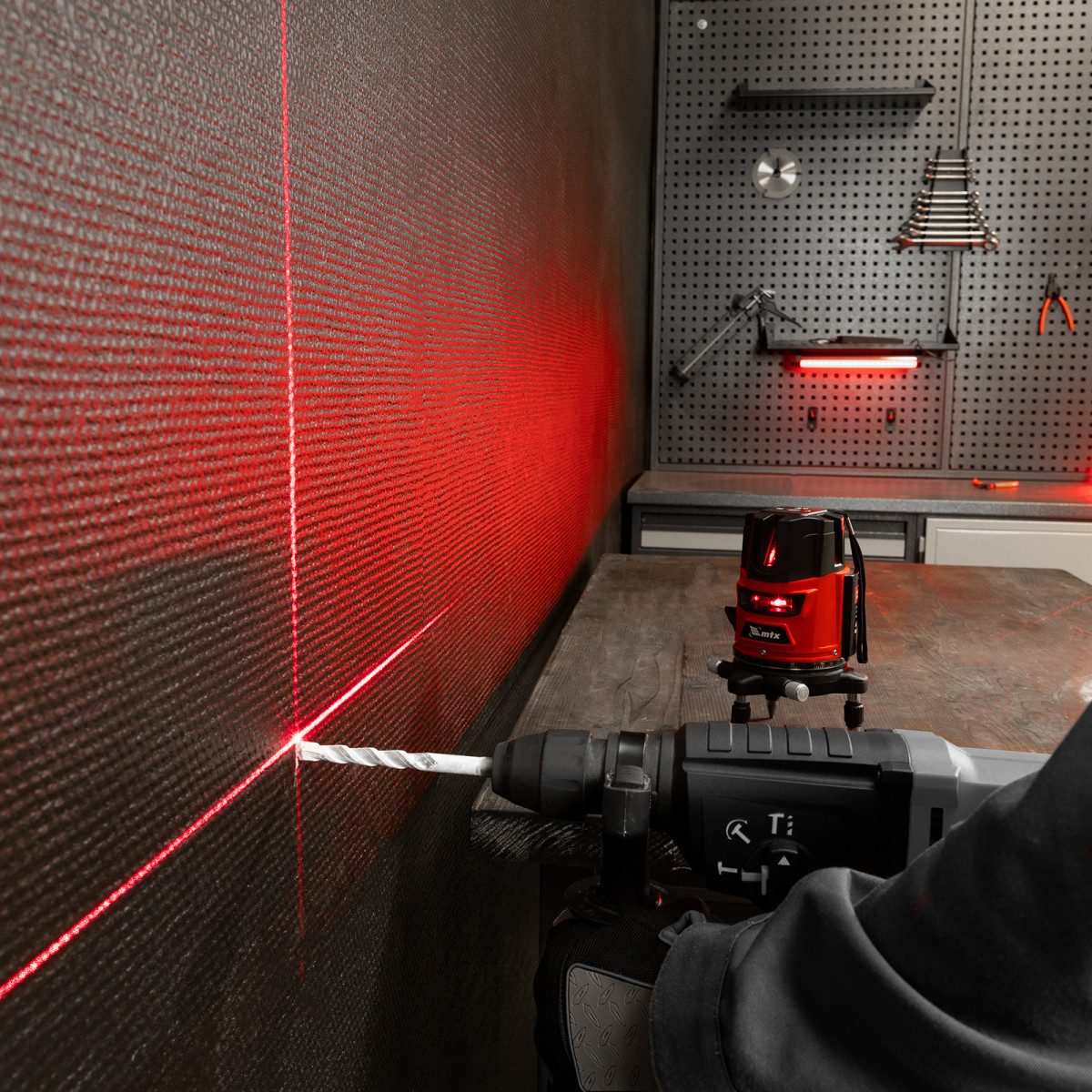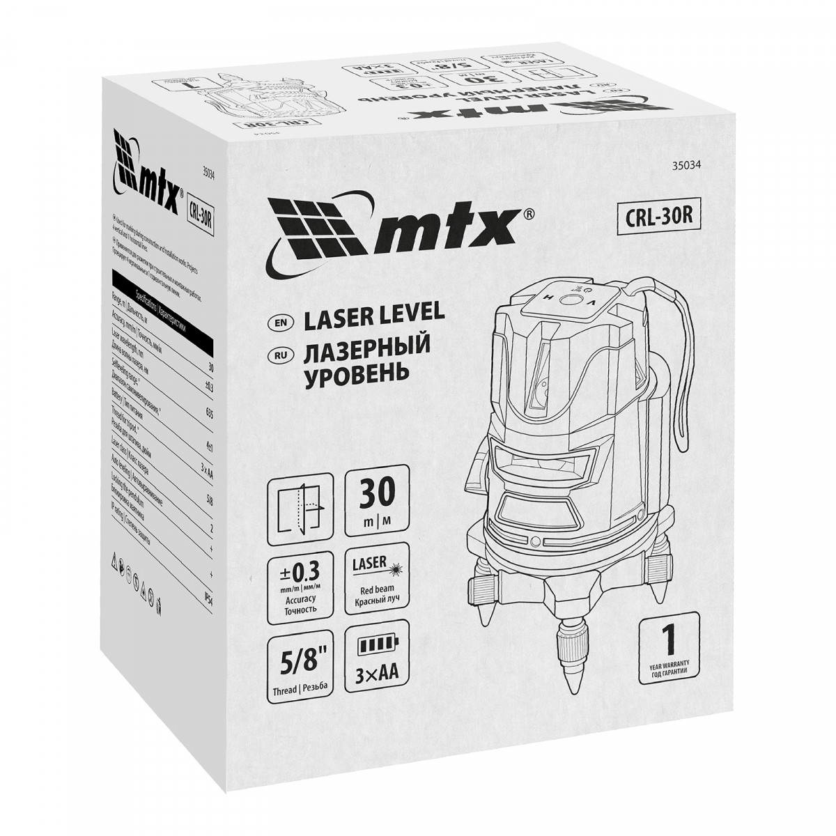 Лазерный уровень MTX CRL-30R 35034 с резьбой 5/8″ под штатив, в комплекте с батарейками, проецирует на поверхность 1 горизонтальный, 4 вертикальных луча красного цвета и точку отвеса дальностью до 30 м. Подходит для бытового применения в помещениях. Погрешность измерений составляет всего ±1,5 мм 5 м.