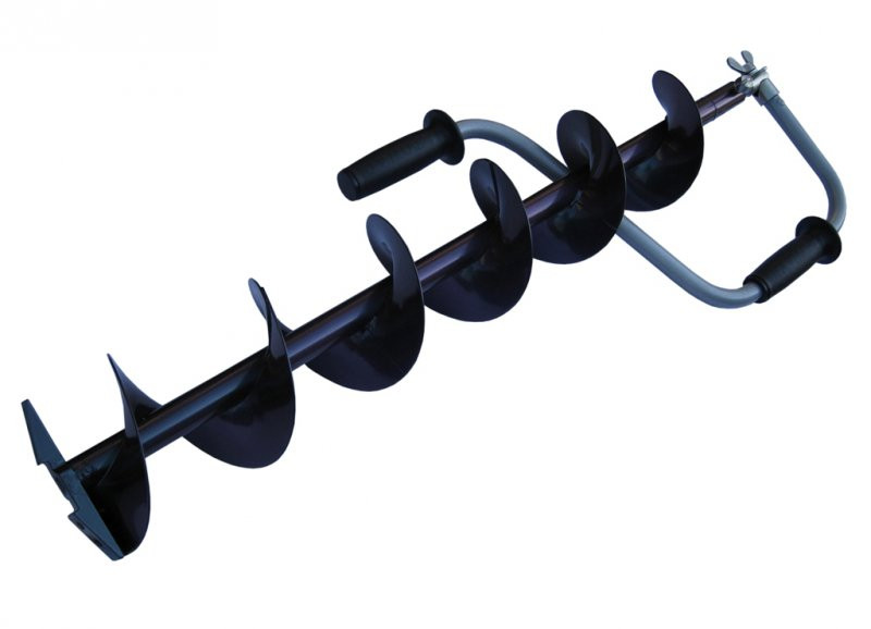 Бурение лунок во льду ускоряется благодаря двуручной конструкции смещенных рукояток.