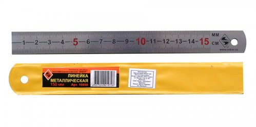 Линейка металлическая с глубоко гравированной шкалой, цифры черные, десятки сантиметров выделены красным цветом, начало шкалы 0,5 мм. Ширина и толщина линеек больше, чем по Российским стандартам.