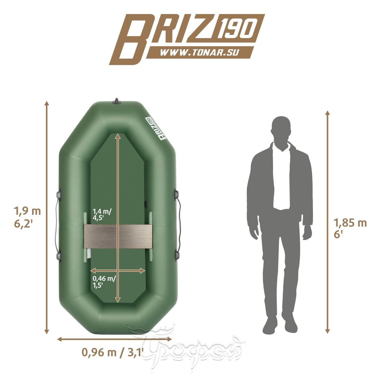 Характеристики лодки «Бриз 190»: • Длина лодки наибольшая: 1,9 м; • Ширина наибольшая: 0,96 м; • Длина кокпита: 1,4 м; • Ширина кокпита: 0,46 м; • Диаметр баллона наибольший: 0,27 м; • Грузоподъемность: 150 кг; • Пассажировместимость: 1 человек; • Рабочее давление в баллоне: 0,2 кгс/см2; • Плотность ПВХ-ткани: 750 гр/м2; • Упаковка: сумка-рюкзак; • Вес комплекта: 6,3 (±0,2 кг); • Размер упаковки: 64х36х18 см; • Дно: натяжное; • Сиденье: банка из влагостойкой фанеры 55х19х1 см ; • Цвет: зелёный. Лодка поставляется со стандартным набором комплектующих: • Ножной насос 3 л; • 2 гребка; • Жесткое сиденье; • Сумка для хранения и перевозки; • Ремкомплект и руководство по эксплуатации (паспорт). Гарантия: • Материал корпуса лодки - 2 года на случай образования трещин, пористости и гниения; • Швы корпуса - 5 лет на случай расслоения;