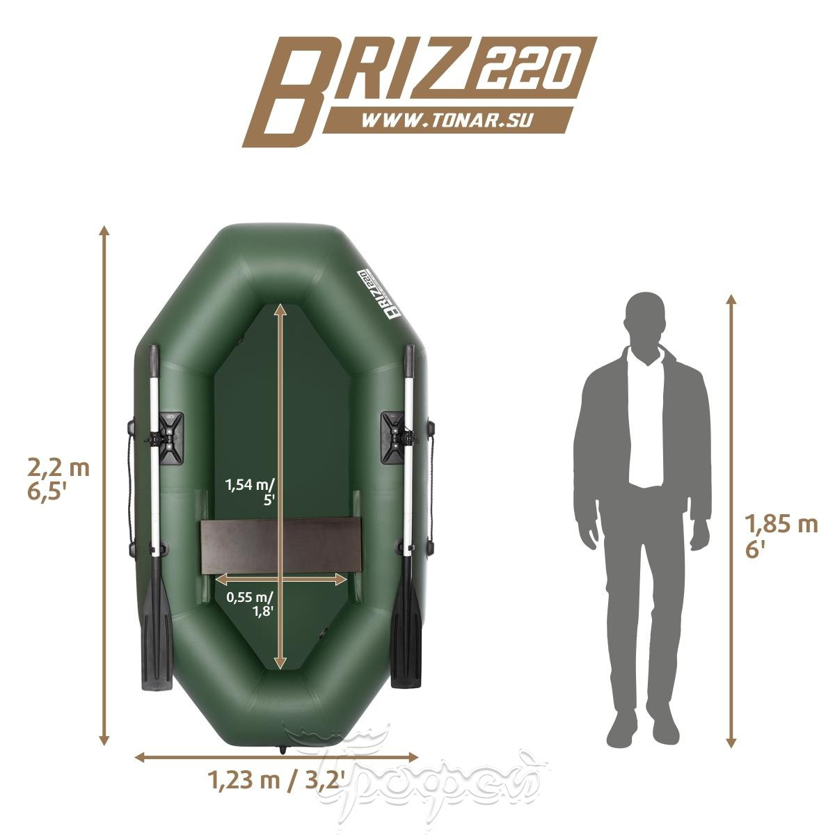 Характеристики лодки «БРИЗ 220»: • Длина наибольшая: 2,2 м; • Ширина наибольшая: 1,23 м; • Длина кокпита: 1,54 м; • Ширина кокпита: 0,55 м; • Диаметр баллона наибольший: 0,33 м; •Вес комплекта: 9,7 (±0,2 кг); • Размер упаковки: 80х40х18 см; • Грузоподъемность: 180 кг; • Пассажировместимость: 1 человек; • Количество герметичных отсеков: 2 шт; • Рабочее давление в баллоне: 0,2 кгс/см2; • Плотность ПВХ-ткани: 750 гр/м2; • Дно: натяжное; • Цвет: зеленый. Лодка поставляется со стандартным набором комплектующих: • Ножной насос 3 л; • 2 весла с держателями весла в уключине; • 1 жесткое сиденье; • Сумка-рюкзак для хранения и перевозки; • Ремкомплект и руководство по эксплуатации (паспорт). Гарантия: • Материал корпуса лодки - 2 года на случай образования трещин, пористости и гниения; • Швы корпуса - 5 лет на случай расслоения;