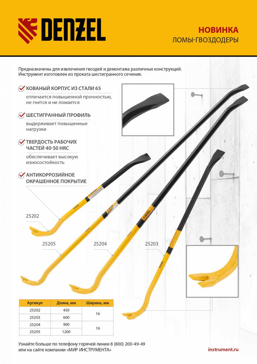 Лом-гвоздодер, 900 мм, шестигранный 19 мм, окрашенный, сталь 65 Denzel