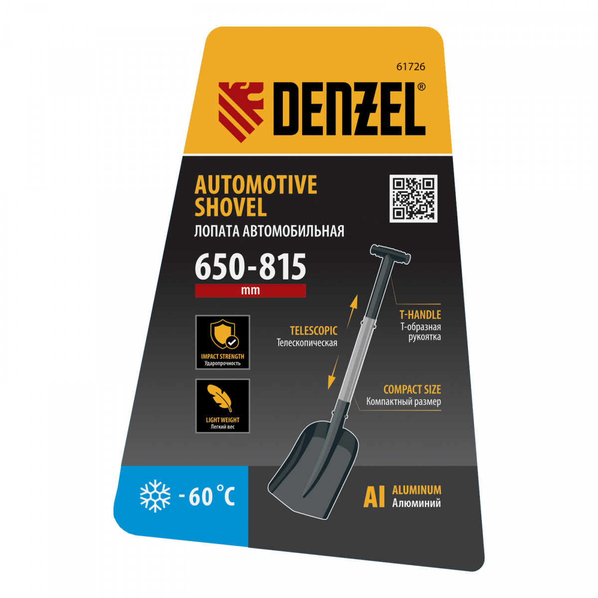 Алюминиевая автомобильная лопата Denzel 61726 размером 212 х 280 мм, с телескопическим черенком длиной 650-815 мм, позволяет освободить машину, попавшую в снежный или песчаный занос. Сохраняет рабочие качества при температуре до -60 °C и оптимальна для применения в экстремальных климатических условиях.