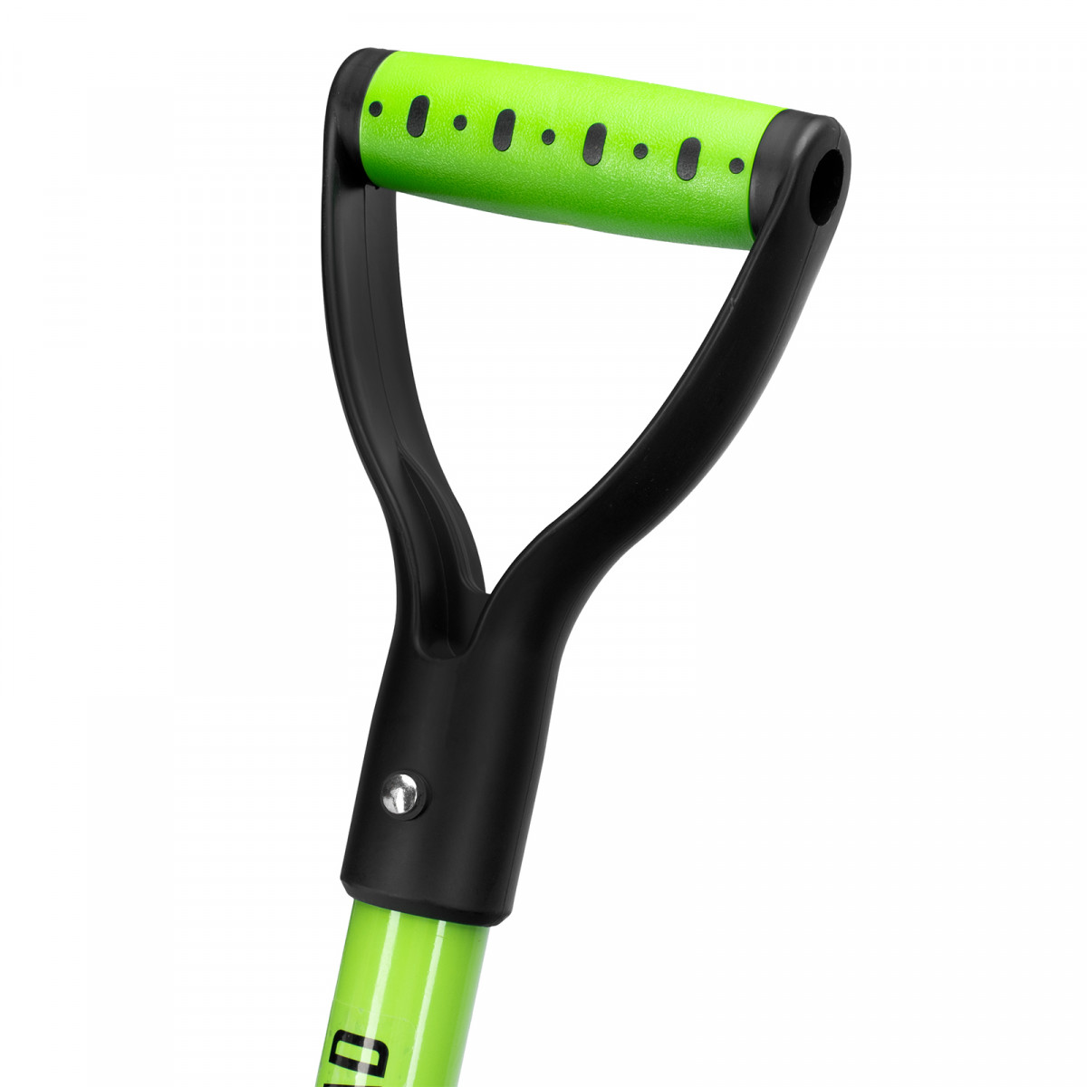 - Продуманная конструкция — фибергласовый черенок не утяжеляет лопату и не разрушается под действием ультрафиолета, а удлиненная цельновырубная тулейка предотвращает его излом.