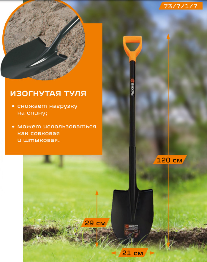 Лопата штыковая с изогнутой тулей металлический черенок Вихрь 73/7/1/7 используется для обработки почвы или при выполнении строительных работ.Надежный и прочный стальной черенок круглого сечения.Ребра жесткости повышают прочность и позволяют работать с твердой почвой.Рессорно пружинная сталь придает лопате дополнительную жесткость и гарантирует легкое проникновение в почву.Эргономичная D- образная ручка удобно лежит в руке и обеспечивает комфорт в работе.Стальной черенок надежный и прочный.Изогнутая туля снижает нагрузку на спину, может использоваться как совковая лопата.