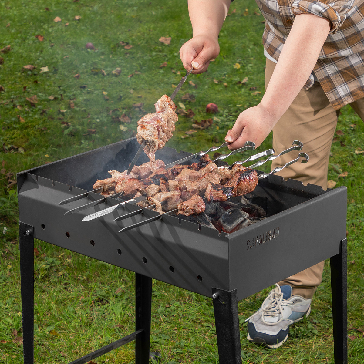 - Удобное использование — благодаря специальным прорезям в корпусе мангала шампуры не скатываются с него.