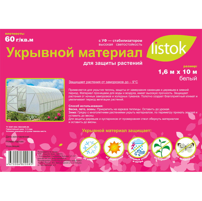 Защищает от заморозковдо -7-8С.Предназначен для покрытия каркасов теплиц и парников, штамбов деревьев, кустарников, многолетних растений, компостных ям.