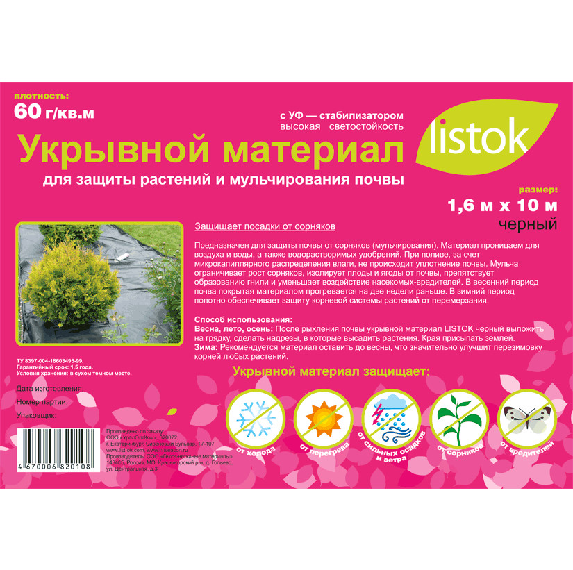Материал укрывной LISTOK суф-60 1,6*10м/16 черный