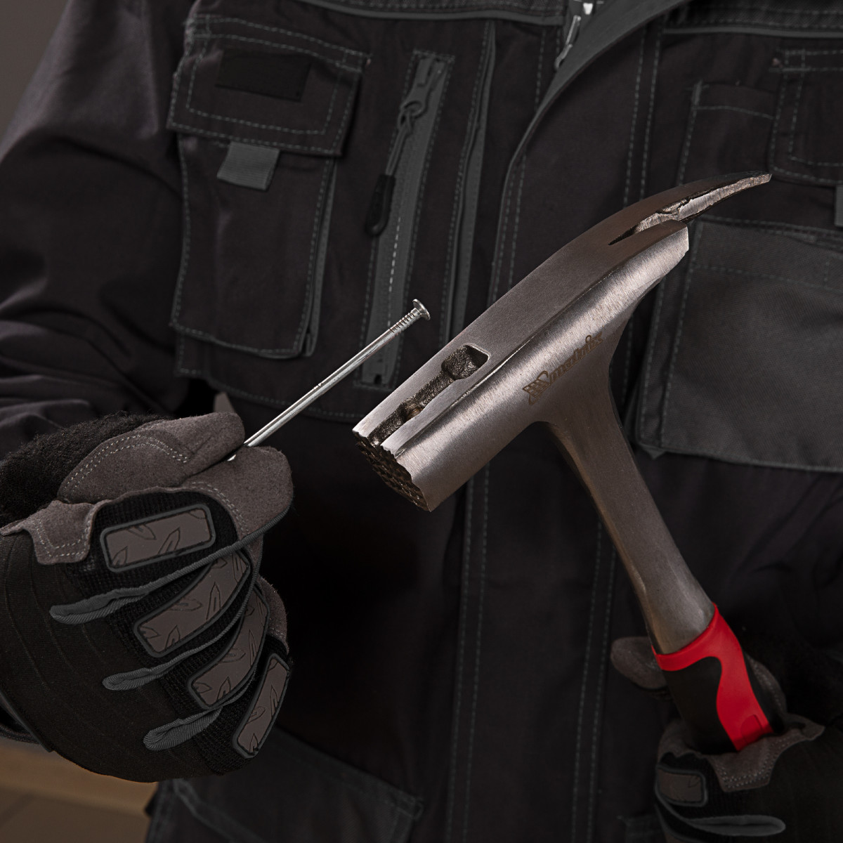 Цельнометаллический молоток кровельщика Matrix 10620 с головкой весом 600 г и двухкомпонентной рукояткой — специализированный инструмент для кровельных работ. Насечки на рабочей поверхности бойка предотвращают соскальзывание, если удар по гвоздю нанесен под углом. Противоположная часть головки представляет собой заостренный клин для пробивания отверстий в листовом металле и отгибания кромок. Гвоздодер позволяет вытягивать неправильно забитые гвозди для их выпрямления.