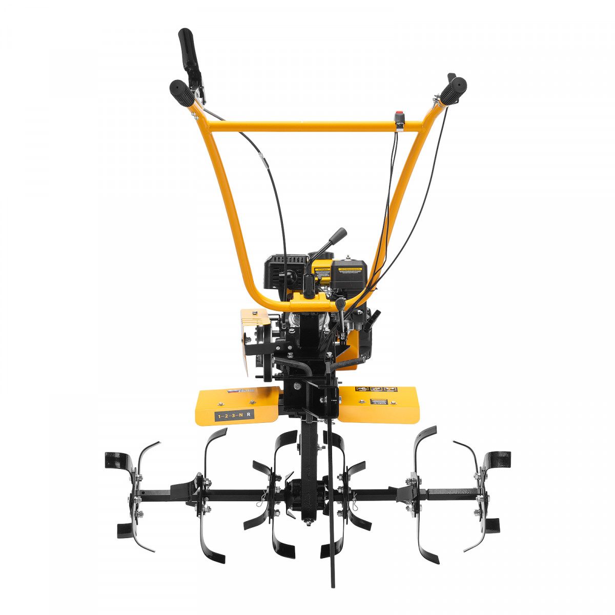 Мотоблок Denzel DPT-370S 56443 мощностью 7 л. с., с 24 фрезами (3 х 4 с каждой стороны), шкивом отбора мощности (ШОМ), количеством передач 3 вперед/1 назад, предназначен для рыхления, боронования, выравнивания почвы, прополки и выполнения других сельскохозяйственных работ на огородных и садовых участках при температуре от -15 до +40 ℃. Максимальная ширина обработки достигает 1000 мм, максимальная глубина — 350 мм.