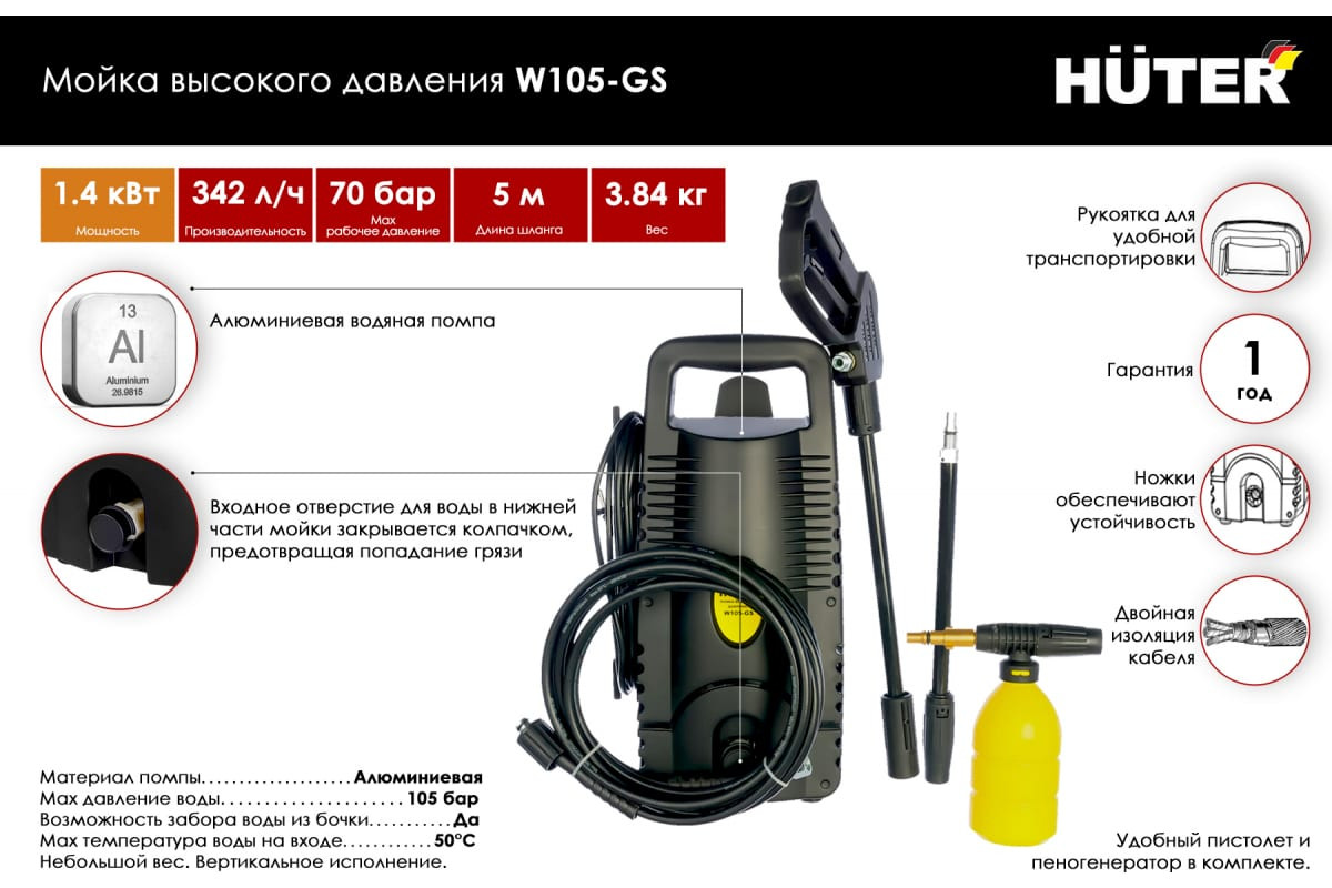 Мойка HUTER W105-GS работает от синхронного щеточного электродвигателя мощностью 1400 Вт. В комплекте идет шланг высокого давления длиной 5 метров, распылительный пистолет и пенообразователь для эффективного удаления сажи, пятен жира.