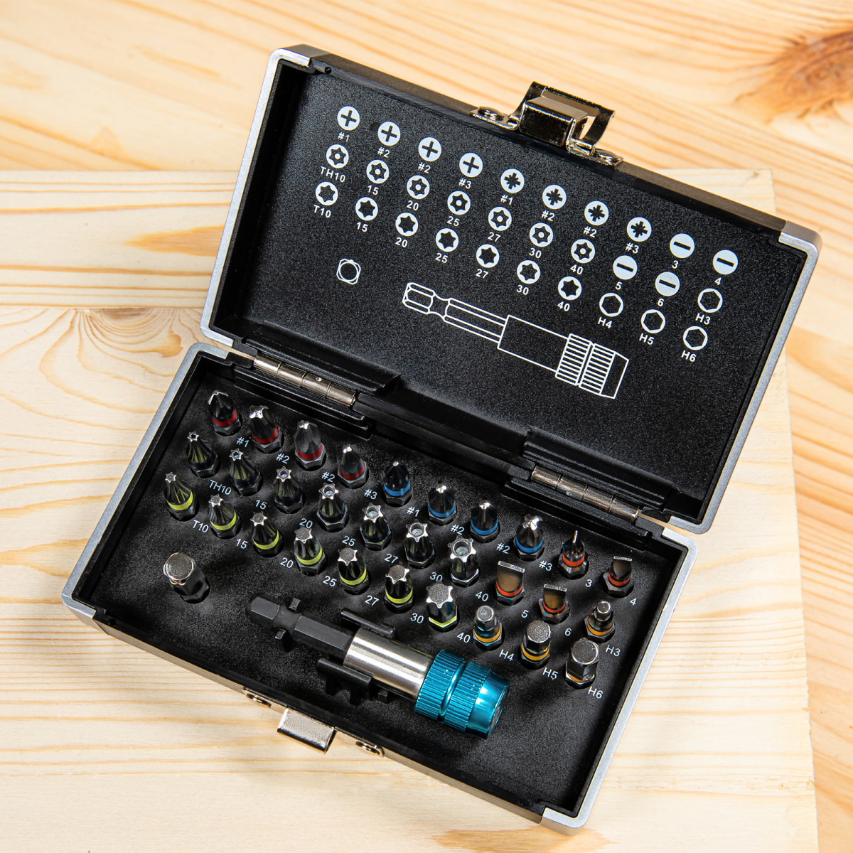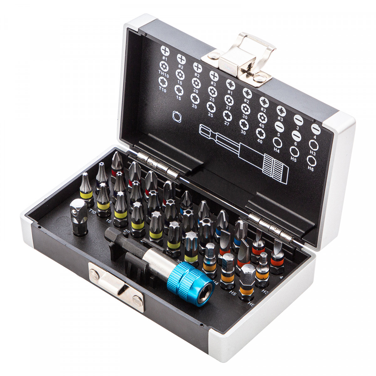 Набор бит с магнитным адаптером Gross 11363 из стали S2, в пластиковый кейсе, включает в себя 32 предмета для монтажа и демонтажа резьбовых соединений. Набор подойдет для выполнения ремонтных, монтажных и слесарных работ, в том числе для сборки мебели, бытовых электроприборов, самокатов и велосипедов. В комплект входят биты самых актуальных размеров, переходник с шестигранника на квадрат 1/4 дюйма и магнитный адаптер для бит.