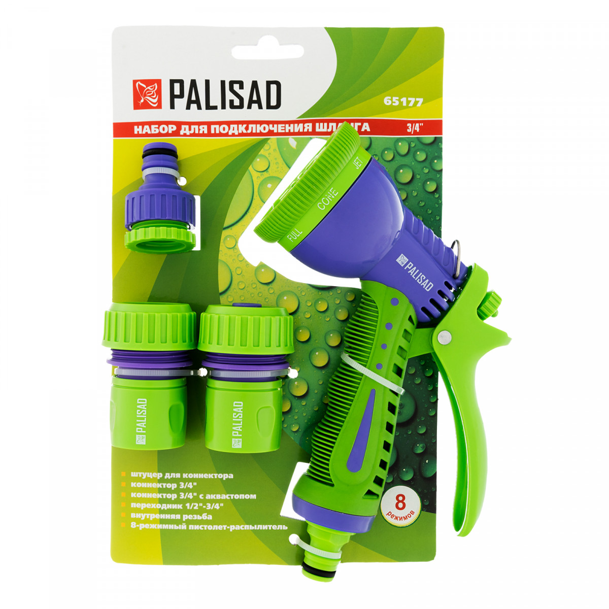 Набор для подключения шланга 3/4,пистолет 8 режимов полива, адаптер, 2 соединителя Palisad