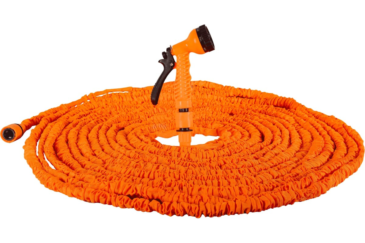 Шланг из прочного латекса растягивается до 50м, обеспечивая удобство и эффективность при поливе.